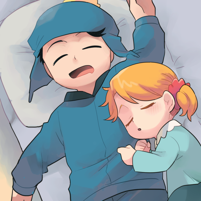 1boy 1girl black_hair brother_and_sister child couch craig_tucker hair_ornament hair_scrunchie lying on_back on_side open_mouth orange_hair scrunchie siblings sleeping south_park tricia_tucker tsunoji twintails winter_clothes