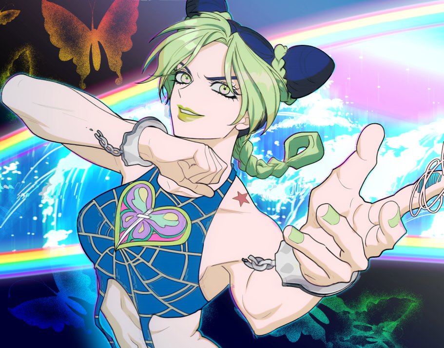 1girl birthmark braid breasts bug butterfly cuffs double_bun gooonja green_eyes green_hair green_lips green_nails hair_bun handcuffs insect jewelry joestar_birthmark jojo_no_kimyou_na_bouken kuujou_jolyne medium_breasts multicolored_hair nail_polish navel smile solo stone_free stone_ocean two-tone_hair upper_body