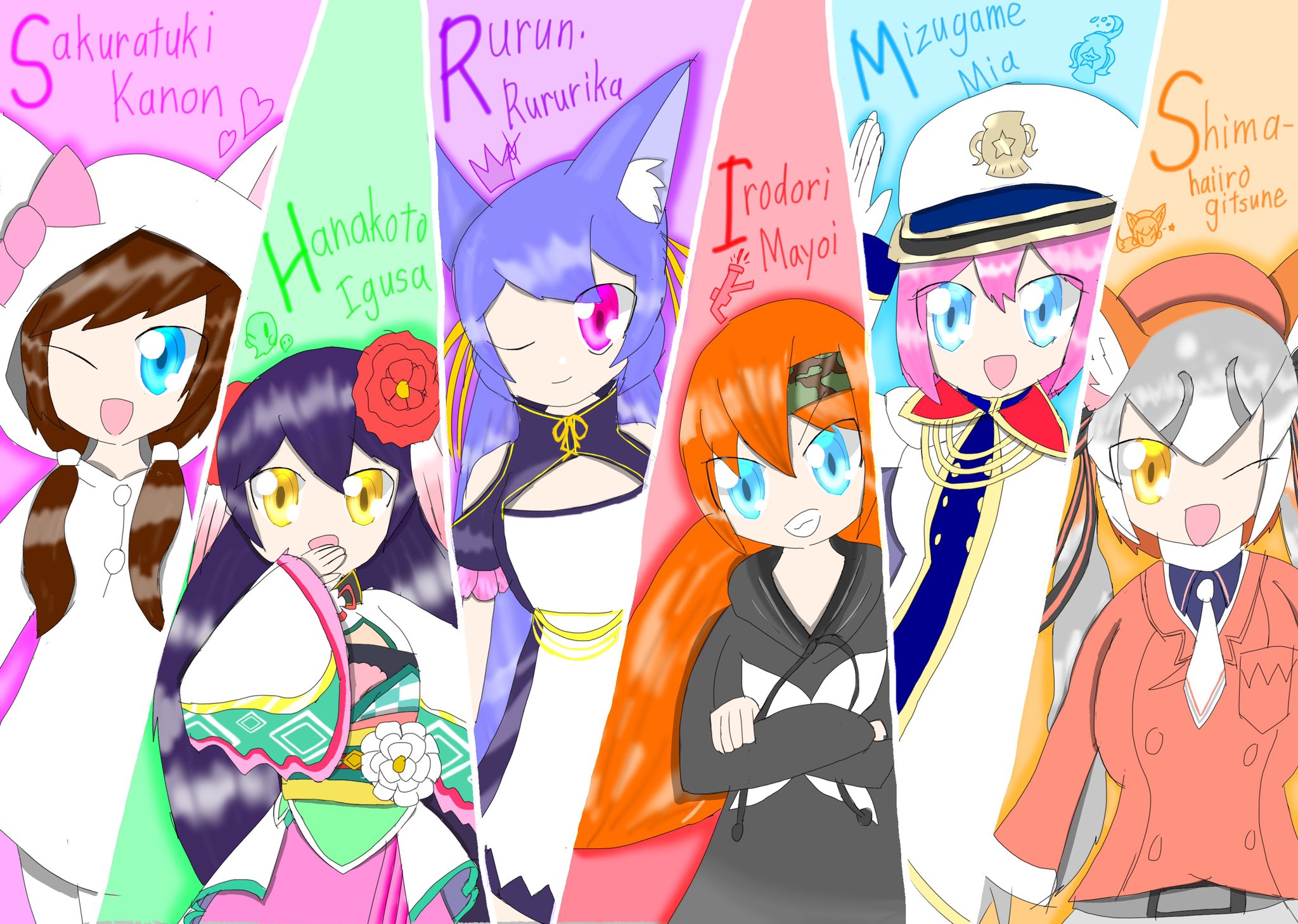.live 6+girls black_hair blue_hair brown_hair grey_hair hanakoto_igusa highres indie_virtual_youtuber irodori_mayoi island_fox_(kemono_friends) kemono_friends kemono_friends_v_project long_hair mizugame_mia multicolored_hair multiple_girls orange_hair pink_hair re:act rurun_rururica sakurazuki_kanon shrims virtual_youtuber