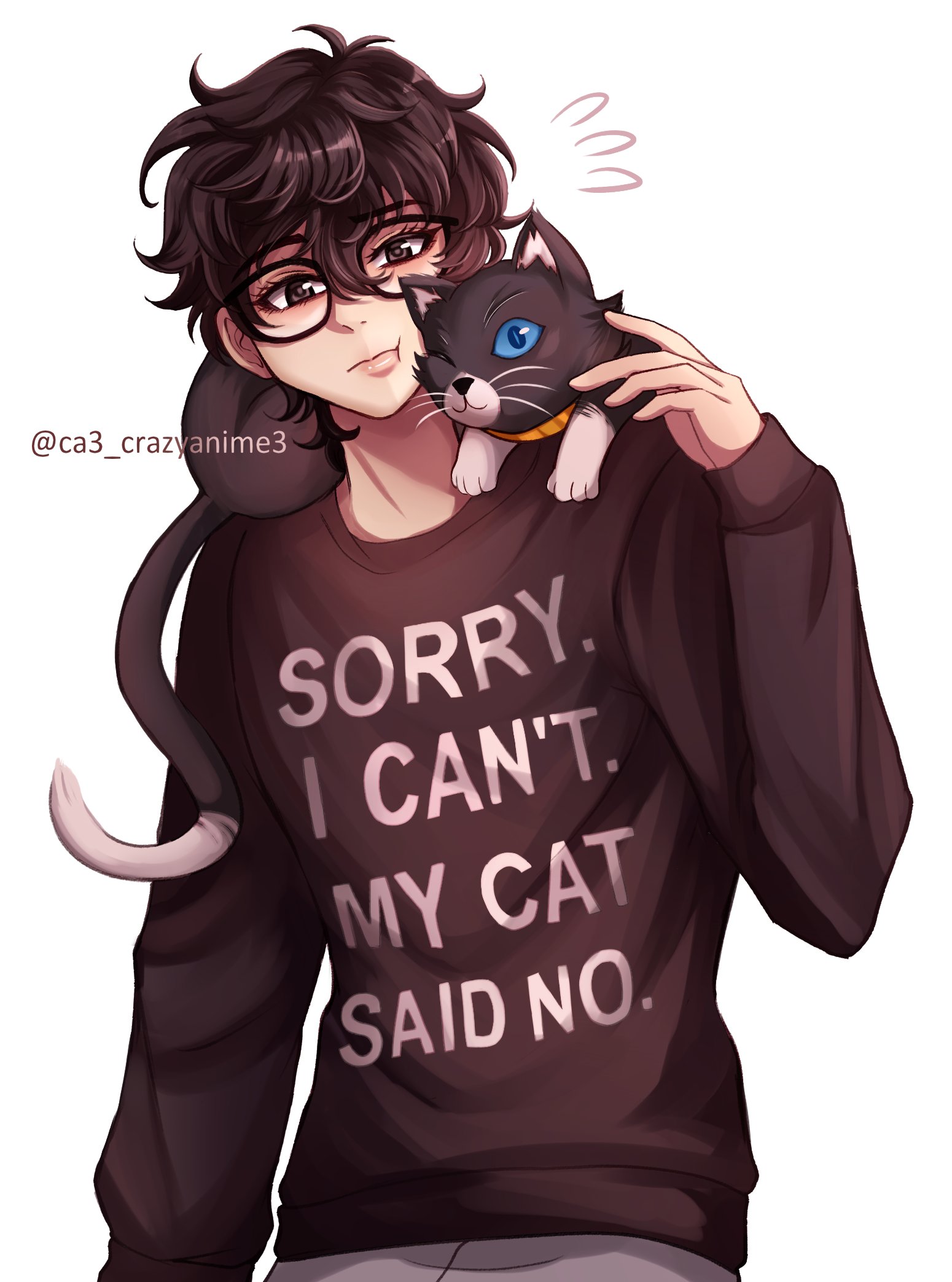 1boy amamiya_ren animal animal_on_shoulder artist_name black_cat black_eyes black_hair black_shirt cat clothes_writing commentary crazyanime3 english_commentary english_text glasses highres long_sleeves male_focus morgana_(cat)_(persona_5) morgana_(persona_5) persona persona_5 shirt short_hair solo sweatdrop upper_body white_background