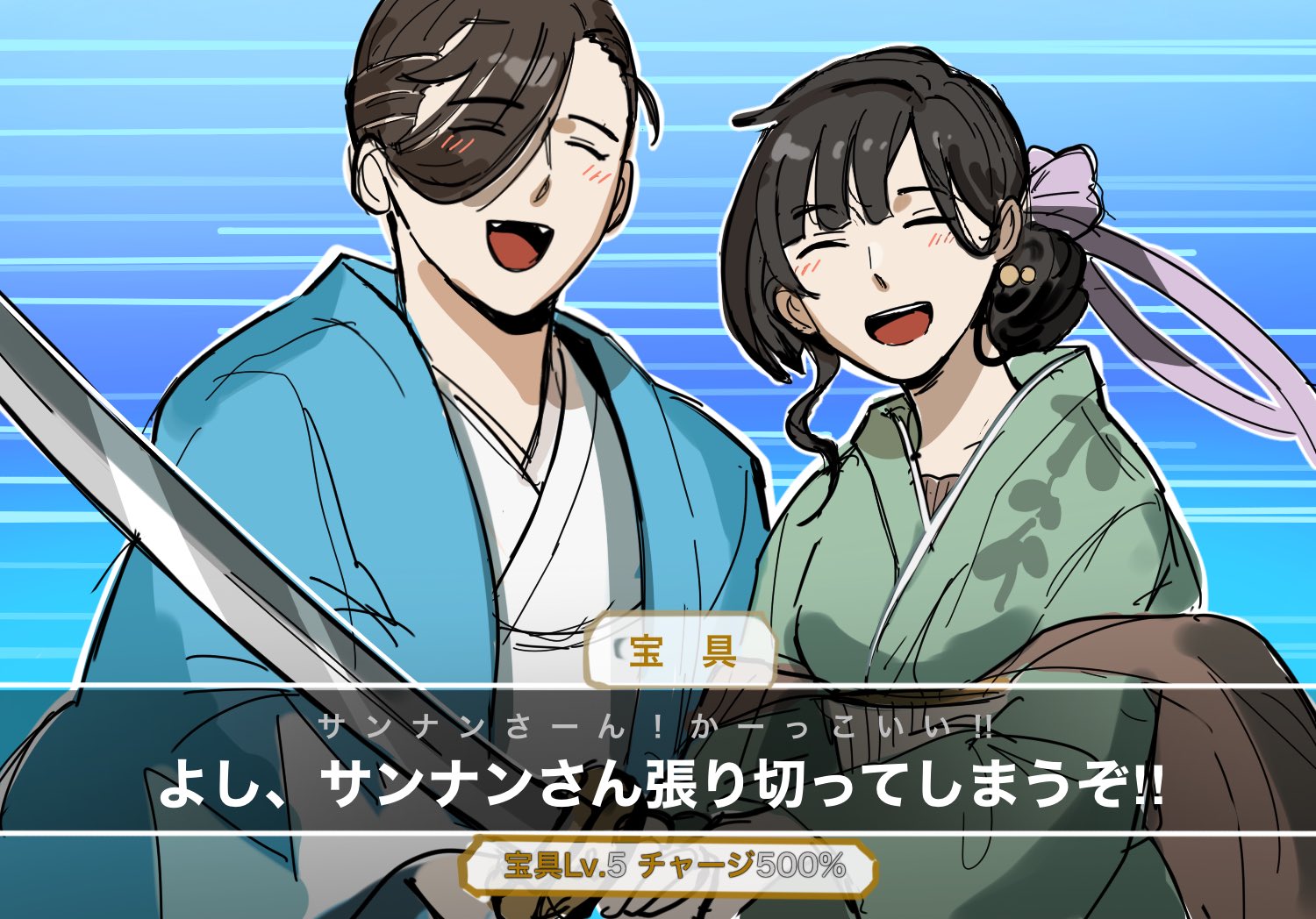 1boy 1girl :d ^_^ akesato_(fate) black_hair blue_jacket blush brown_hair brown_shawl brynhild_sigurtein closed_eyes donkey_fgo fangs fate/grand_order fate_(series) green_kimono hair_bun hair_over_one_eye hair_pulled_back haori holding holding_sword holding_weapon jacket japanese_clothes katana kimono open_mouth outline purple_ribbon ribbon shawl short_hair single_hair_bun smile sword teeth upper_body upper_teeth_only weapon white_kimono white_outline yamanami_keisuke_(fate) yamanami_keisuke_(third_ascension)_(fate)