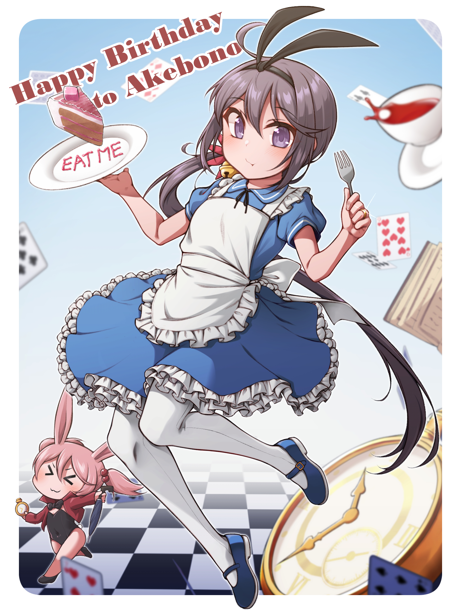 >_< 2girls akebono_(kancolle) alice_(alice_in_wonderland) alice_(alice_in_wonderland)_(cosplay) alice's_adventures_in_wonderland animal_ears apron bell black_footwear black_leotard black_tea blue_dress blue_footwear blush cake cake_slice card closed_mouth cosplay cup dress eating fake_animal_ears fake_tail flower food frilled_apron frilled_dress frills hair_bell hair_between_eyes hair_bobbles hair_flower hair_ornament highres jacket jingle_bell kantai_collection leotard long_hair long_sleeves multiple_girls open_clothes open_jacket pantyhose pink_hair plate puffy_short_sleeves puffy_sleeves purple_eyes purple_hair rabbit_ears rabbit_tail red_flower red_jacket sazanami_(kancolle) shoes short_sleeves side_ponytail strapless strapless_leotard tail tea twintails white_apron white_pantyhose yuki_to_hana