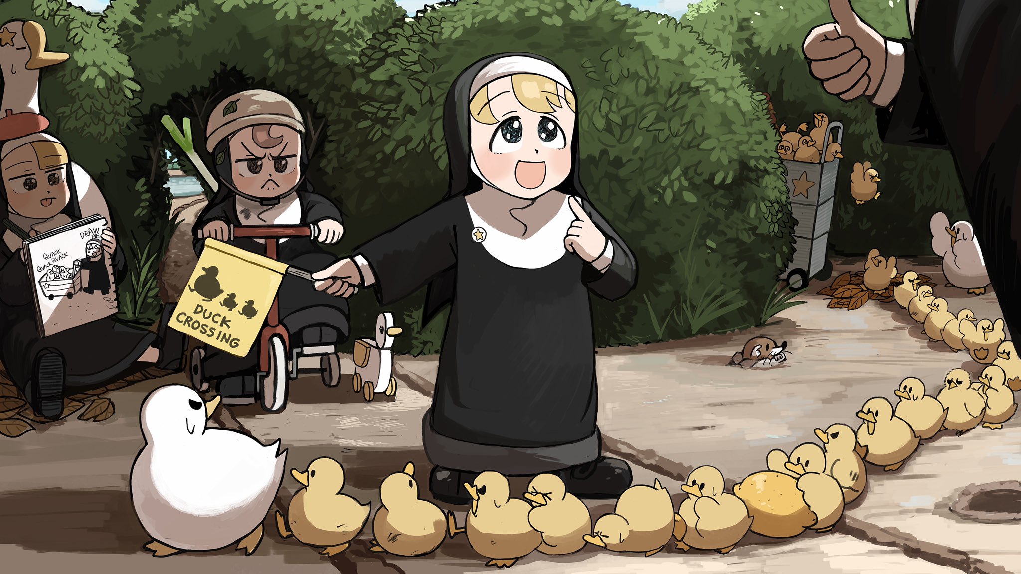 4girls :< :d @_@ aged_down autumn_leaves baby_animal beret bird black_footwear blonde_hair blue_eyes brown_eyes brown_hair bush chick chicken clumsy_nun_(diva) commentary diva_(hyxpk) drawing duck duckling english_commentary flag food froggy_nun_(diva) fruit goose habit hat highres holding holding_flag leaf lemon little_nuns_(diva) mole_(animal) multiple_girls notepad nun nun_headdress odd_one_out open_mouth pointing pointing_at_self red_hat riding_tricycle slice_of_life smile spicy_nun_(diva) star_nun_(diva) star_ornament thumbs_up traditional_nun tricycle yellow_eyes