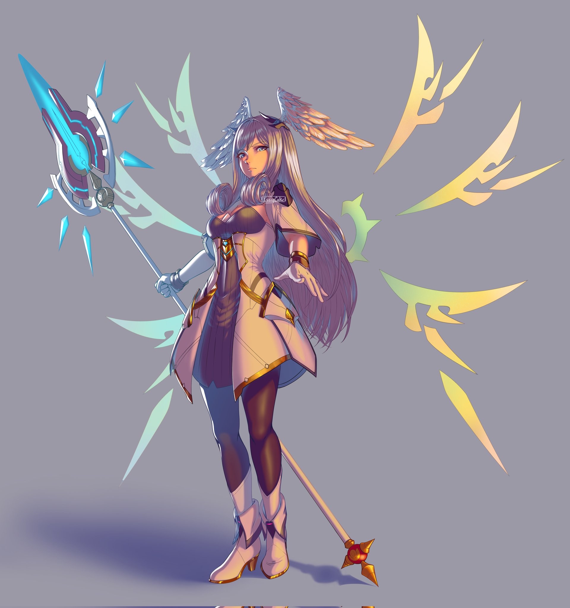 1girl blue_eyes braid breasts cape crown_braid curly_hair dress full_body gloves head_wings highres issycake juliet_sleeves long_hair long_sleeves looking_at_viewer medium_breasts melia_antiqua o-ring pantyhose polearm puffy_sleeves simple_background solo spear staff thighhighs upper_body weapon wings xenoblade_chronicles_(series) xenoblade_chronicles_1 xenoblade_chronicles_3