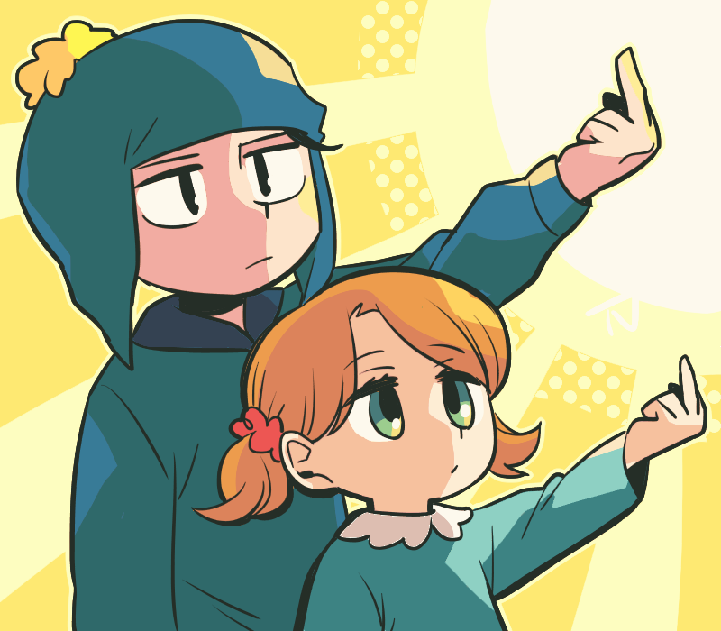 1boy 1girl black_hair blue_jacket brother_and_sister craig_tucker hair_ornament hair_scrunchie hat jacket middle_finger orange_hair scrunchie siblings south_park tricia_tucker tsunoji twintails