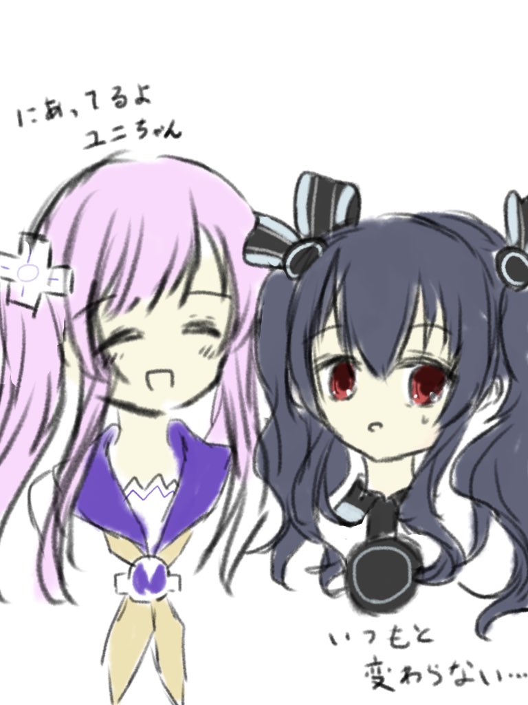 2girls alternate_hairstyle black_hair closed_eyes hair_ribbon happy japanese_text long_hair looking_at_viewer multiple_girls nepgear neptune_(series) open_mouth purple_hair red_eyes ribbon sailor_collar smile solo translation_request twintails uni_(neptunia)