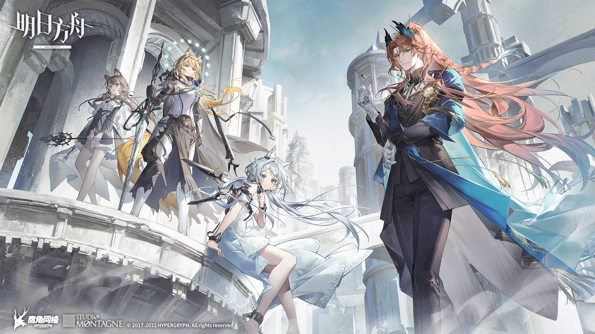 1boy 3girls animal_ears arknights armor blonde_hair blue_eyes braid brown_hair cane coin dress feather_hair_ornament feathers gloves green_eyes grey_hair hair_ornament highres honeyberry_(arknights) honeyberry_(wildness_behind)_(arknights) honeyberry_(wildness_behind)_(arknights) long_hair multiple_girls nearl_(arknights) nearl_the_radiant_knight_(arknights) nearl_the_radiant_knight_(relight)_(arknights) official_art orange_hair passenger_(arknights) passenger_(dream_in_a_moment)_(arknights) ponytail rosmontis_(arknights) rosmontis_(become_anew)_(arknights) tail twintails watch white_dress white_gloves wings yellow_eyes