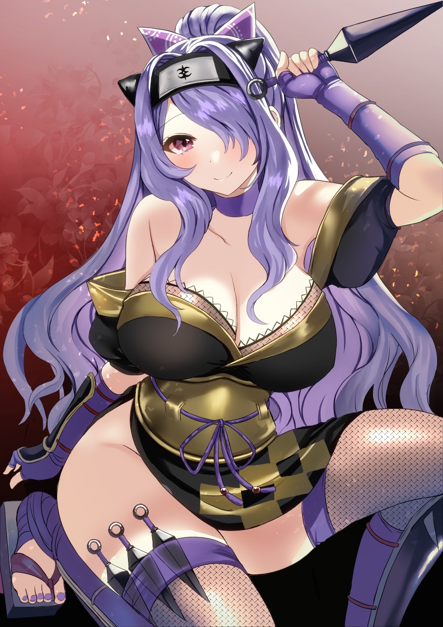 1girl armor bare_shoulders blush breasts camilla_(fire_emblem) camilla_(ninja)_(fire_emblem) cleavage closed_mouth fire_emblem fire_emblem_fates fire_emblem_heroes fishnets gloves hair_ornament hair_over_one_eye highres holding japanese_clothes kimono kunai large_breasts long_hair looking_at_viewer ninja nintendo ponytail purple_eyes purple_hair scarf short_kimono simple_background smile solo tara_(szzj7733) thighhighs tiara very_long_hair wavy_hair weapon