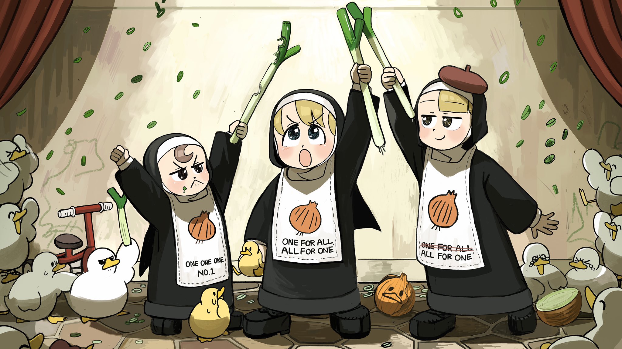 3girls :< :o aged_down apron baby_animal bird black_footwear blonde_hair blue_eyes brown_eyes brown_hair chicken clumsy_nun_(diva) commentary curtains diva_(hyxpk) duck duckling english_commentary food food_bite food_on_face froggy_nun_(diva) habit highres holding holding_food holding_spring_onion holding_vegetable little_nuns_(diva) multiple_girls nun nun_headdress onion slice_of_life smile spicy_nun_(diva) spring_onion tears the_three_musketeers traditional_nun tricycle vegetable yellow_eyes