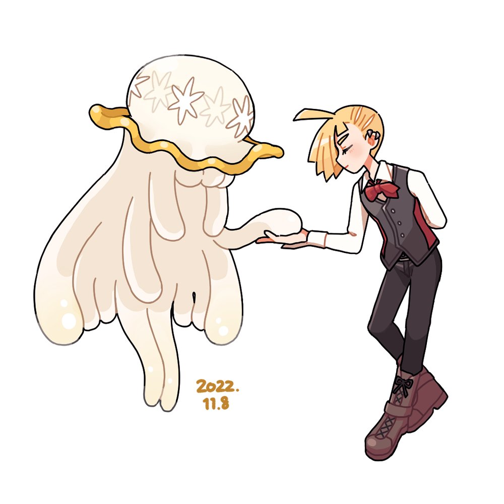1boy ahoge alternate_color blonde_hair blush boots brown_footwear buttons closed_eyes closed_mouth commentary_request daifuku_(pokefuka_art) dated ear_piercing eyelashes from_side gen_7_pokemon gladion_(pokemon) lillie_(nihilego) long_sleeves male_focus nihilego nintendo pants piercing pokemon pokemon_(anime) pokemon_journeys pokemon_swsh111 shiny_pokemon shirt short_hair simple_background smile ultra_beast vest white_background white_shirt