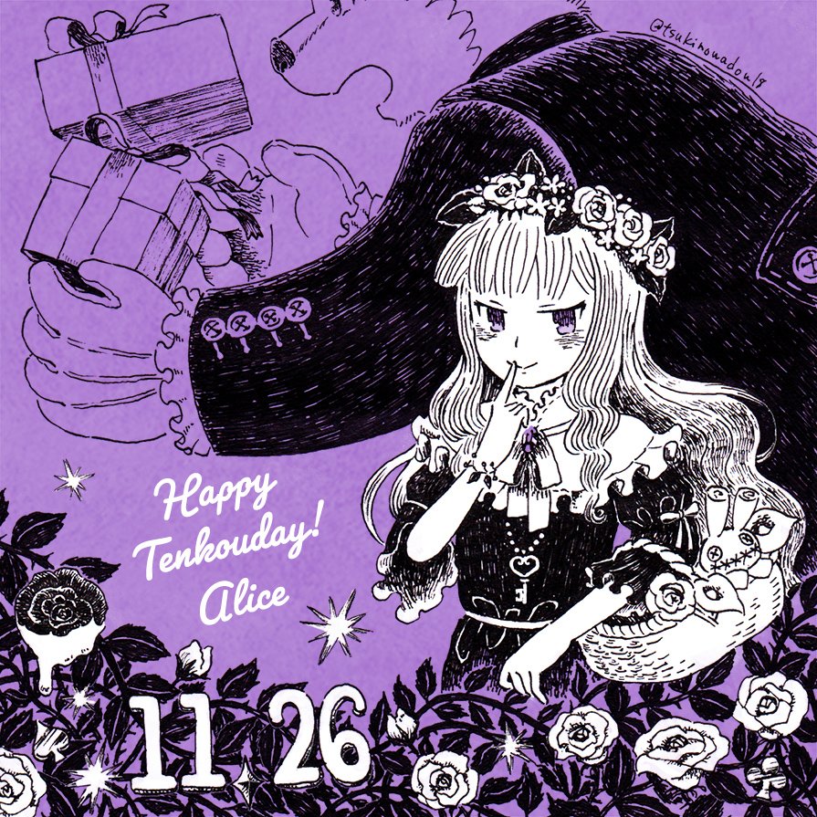 1boy 1girl alice_(housamo) basket bear_boy box catching character_name club_(shape) commentary_request dated dress elbow_carry finger_to_mouth flower frilled_dress frills furry furry_male gift gift_box gloves greyscale_with_colored_background hair_flower hair_ornament holding holding_basket jambavan_(housamo) jewelry key key_necklace long_hair long_sleeves monochrome necklace purple_background purple_eyes purple_theme ribbon rose shushing spade_(shape) sparkle stuffed_animal stuffed_toy tokyo_houkago_summoners tsukinowadou twitter_username upper_body
