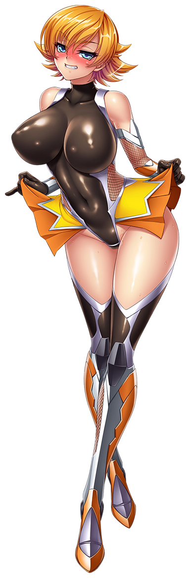 1girl bare_shoulders blonde_hair blue_eyes blush bodysuit breasts clothes_lift curvy fishnets grin highleg highleg_leotard holding_own_skirt igawa_sakura kagami_hirotaka large_breasts leotard lifting_own_clothes naughty_face shiny_clothes shiny_skin skirt skirt_lift smile solo sweat taimanin_(series) taimanin_asagi taimanin_asagi_zero taimanin_rpgx taimanin_suit thighhighs thighs