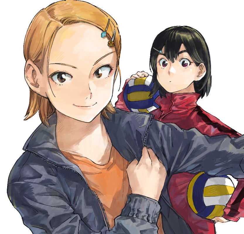 2girls ball black_hair black_jacket brown_eyes forehead hair_behind_ear hair_between_eyes hair_ornament hairclip hiro_(chumo) holding holding_ball jacket medium_hair multiple_girls orange_hair orange_shirt original red_eyes shirt smile track_jacket volleyball volleyball_(object)