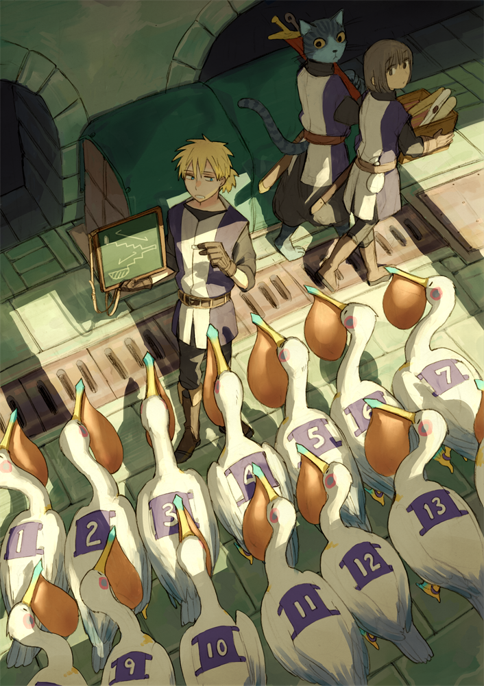 1boy 1girl basket belt bird blonde_hair brown_gloves brown_hair cat_on_person chalkboard colored_sclera from_above gloves indoors ooba pelican pewter_(pfsoz) pixiv_fantasia pixiv_fantasia_scepter_of_zeraldia short_hair standing sunlight uniform walking yellow_sclera