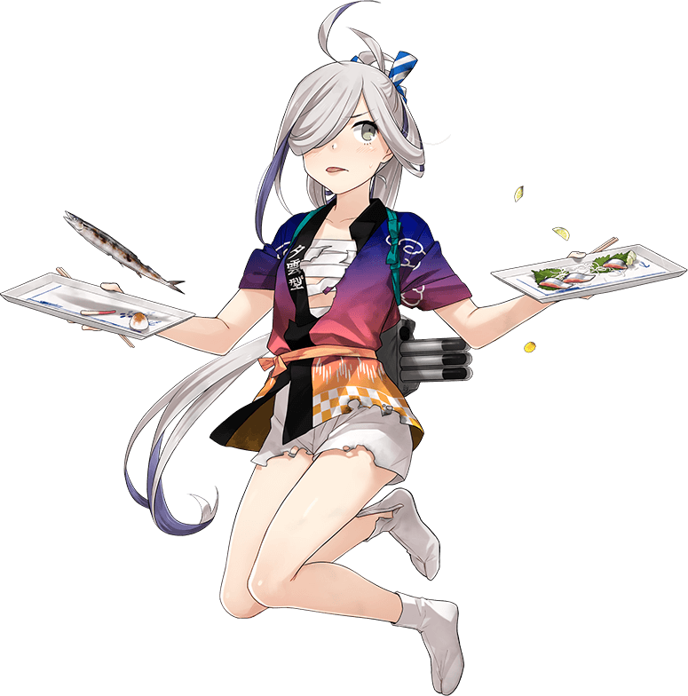 1girl ahoge asashimo_(kancolle) asashimo_(saury_festival)_(kancolle) asashimo_kai_ni_(kancolle) bad_id bad_twitter_id chopsticks fish fish_(food) fujikawa full_body grey_eyes grey_hair hair_over_one_eye happi japanese_clothes kantai_collection long_hair multicolored_hair official_art plate ponytail purple_hair sarashi saury serving shorts solo tabi tongue tongue_out transparent_background
