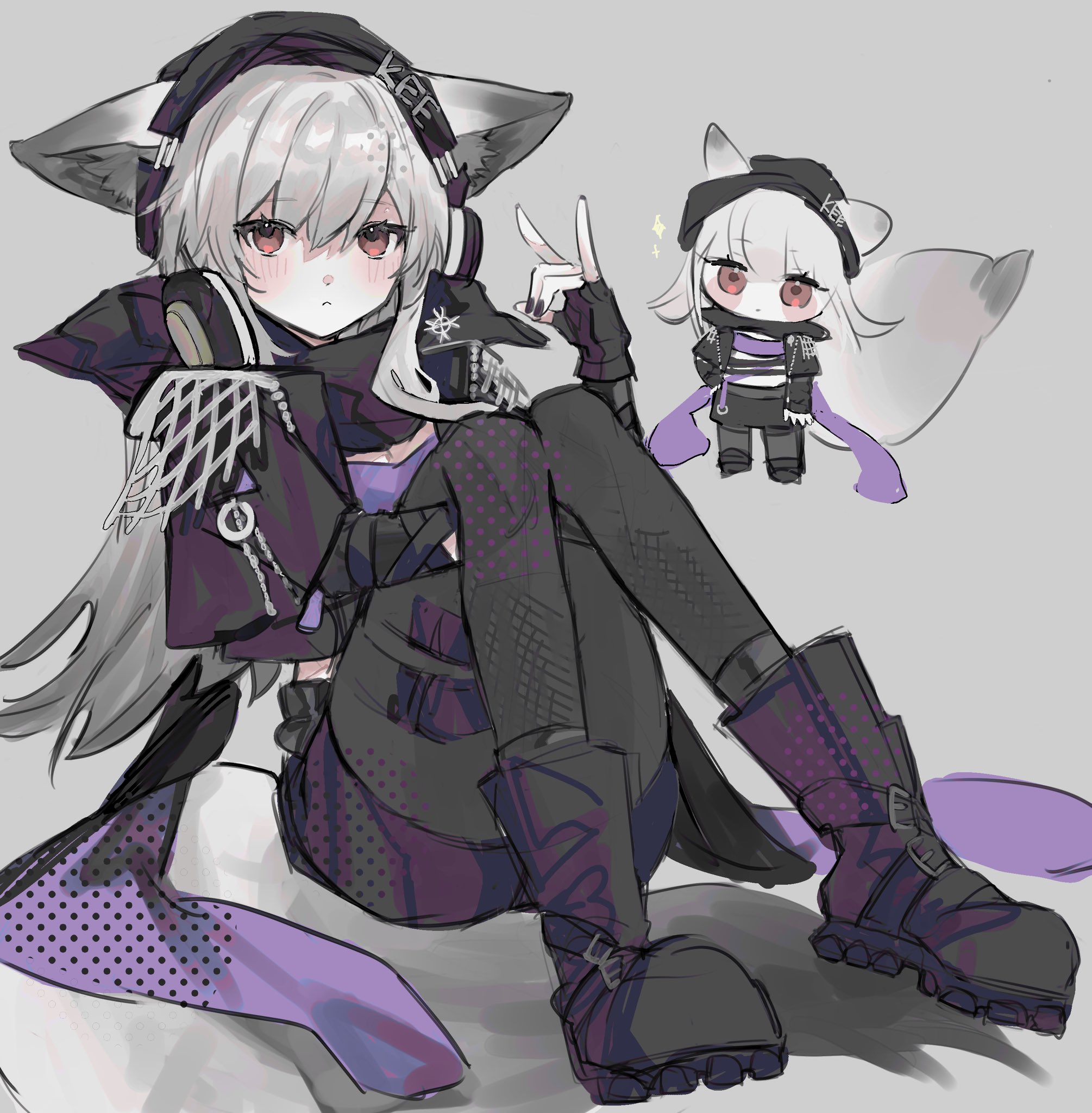 1girl animal_ears arknights beanie black_footwear black_gloves black_headwear black_jacket black_nails black_pantyhose black_shorts blush blush_stickers boots brown_eyes chibi closed_mouth commentary_request ears_through_headwear fingerless_gloves fox_ears fox_girl fox_shadow_puppet fox_tail frostleaf_(arknights) frostleaf_(breaking_the_ice)_(arknights) full_body gloves grey_background hair_between_eyes hand_up hat headphones headphones_around_neck highres hugging_own_legs jacket layered_sleeves pantyhose_under_shorts long_sleeves looking_at_viewer mi_(mituki_wandoro) multiple_views nail_polish pantyhose short_over_long_sleeves short_shorts short_sleeves shorts sparkle standing tail