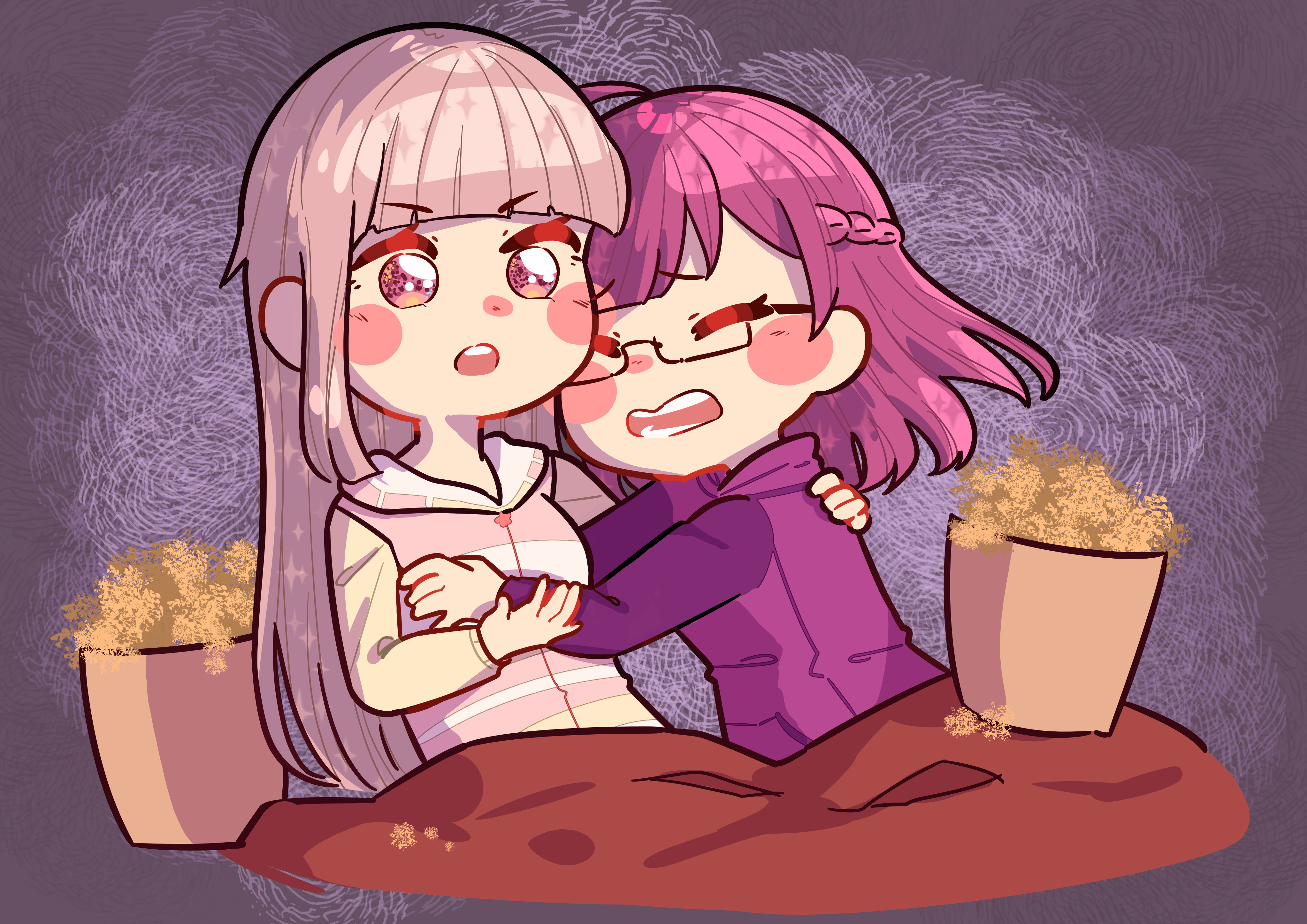2girls :o absurdres ahoge alternate_costume blunt_bangs blush_stickers braid chibi closed_eyes commentary commission english_commentary food hair_down hand_on_another's_arm hand_on_another's_back highres hood hood_down hoodie hug long_hair long_sleeves magia_record:_mahou_shoujo_madoka_magica_gaiden mahou_shoujo_madoka_magica medium_hair mogu_m.g multiple_girls official_alternate_costume open_mouth pajamas pink_eyes pink_hair pink_hoodie popcorn purple_hair purple_hoodie second-party_source side_braid sidelocks sparkle straight_hair striped_clothes striped_hoodie swept_bangs tamaki_iroha tamaki_iroha_(pajamas_costume) tokiwa_nanaka v-shaped_eyebrows very_long_hair yellow_sleeves