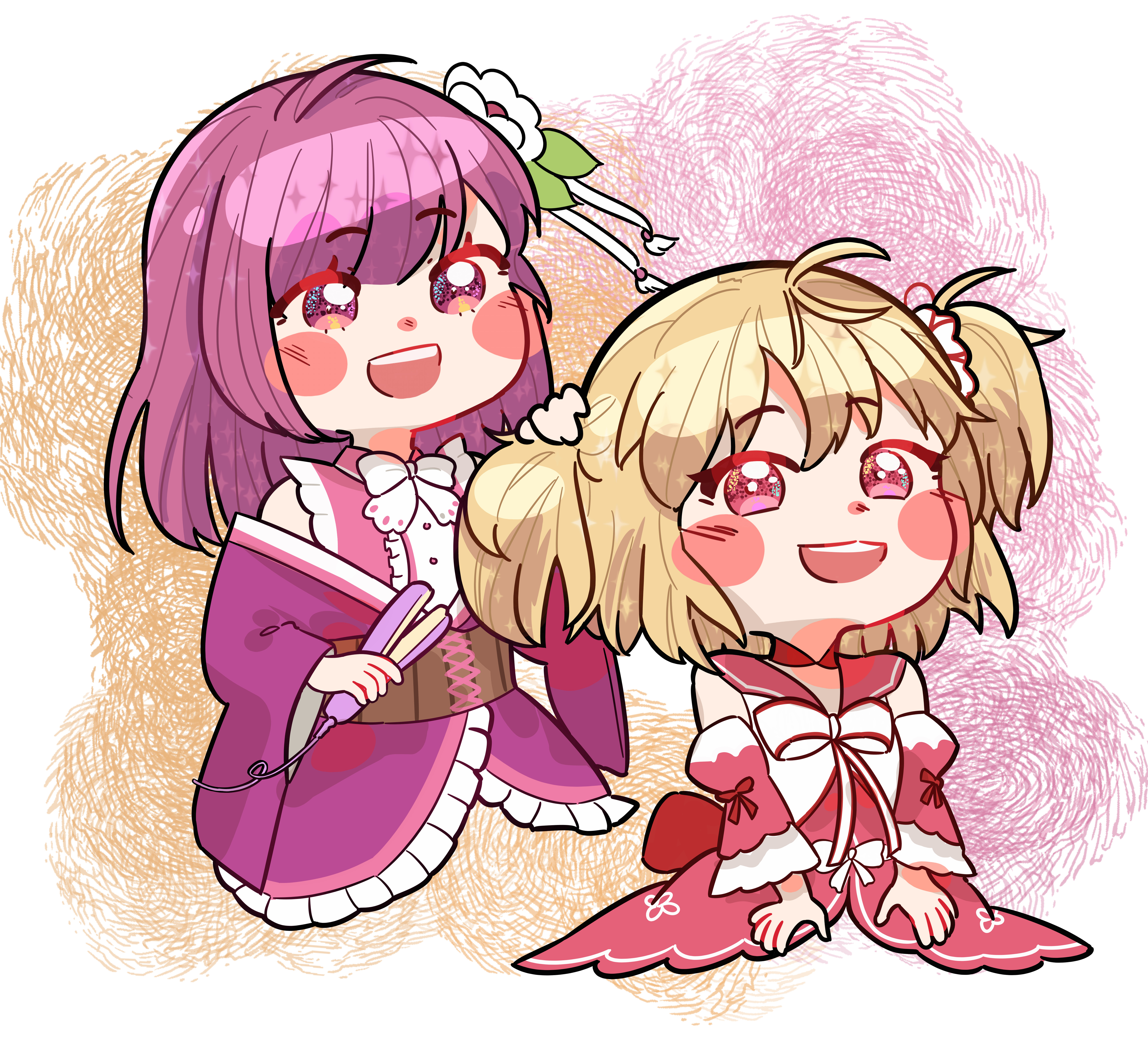 2girls :d absurdres ahoge ayano_rika blonde_hair blunt_bangs blush_stickers bow bowtie brown_corset bunching_hair buttons center_frills chibi choker collared_shirt commission corset cropped_torso cross-laced_clothes detached_sleeves dress flower frilled_kimono frilled_shirt frills furisode hair_between_eyes hair_flower hair_iron hair_ornament highres japanese_clothes kimono kimono_skirt leaf leaf_on_head long_sleeves magia_record:_mahou_shoujo_madoka_magica_gaiden magical_girl mahou_shoujo_madoka_magica medium_hair mogu_m.g multiple_girls off_shoulder open_mouth pink_eyes pink_shirt purple_eyes purple_hair purple_kimono red_bow red_choker red_dress red_sailor_collar red_sleeves sailor_collar sailor_dress scrunchie second-party_source shirt short_kimono single_sidelock sleeveless sleeveless_shirt smile sparkle straight_hair tokiwa_nanaka two_side_up white_bow white_bowtie white_flower white_scrunchie