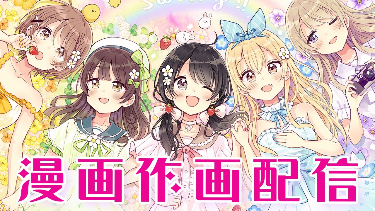5girls bad_id bad_twitter_id bare_shoulders beret black_hair blonde_hair blue_dress blue_hairband blue_ribbon blue_sailor_collar blush bow braid brown_eyes brown_hair brown_sailor_collar camera character_request collared_shirt commentary_request dress dress_shirt flower food food-themed_hair_ornament green_bow hair_between_eyes hair_bow hair_flower hair_ornament hair_ribbon hairband hairclip hat higuchi_kaede_(swing!!) holding holding_camera holding_food long_hair low_twintails miyasato_haruka multiple_girls okamoto_natsuhi pink_shirt purple_eyes ribbon sailor_collar sakura_oriko shirt short_sleeves sleeveless sleeveless_dress strap_slip strapless strapless_dress strawberry_hair_ornament striped_bow swing!! twintails very_long_hair white_bow white_dress white_flower white_headwear white_shirt wide_sleeves x_hair_ornament yokomine_ibuki