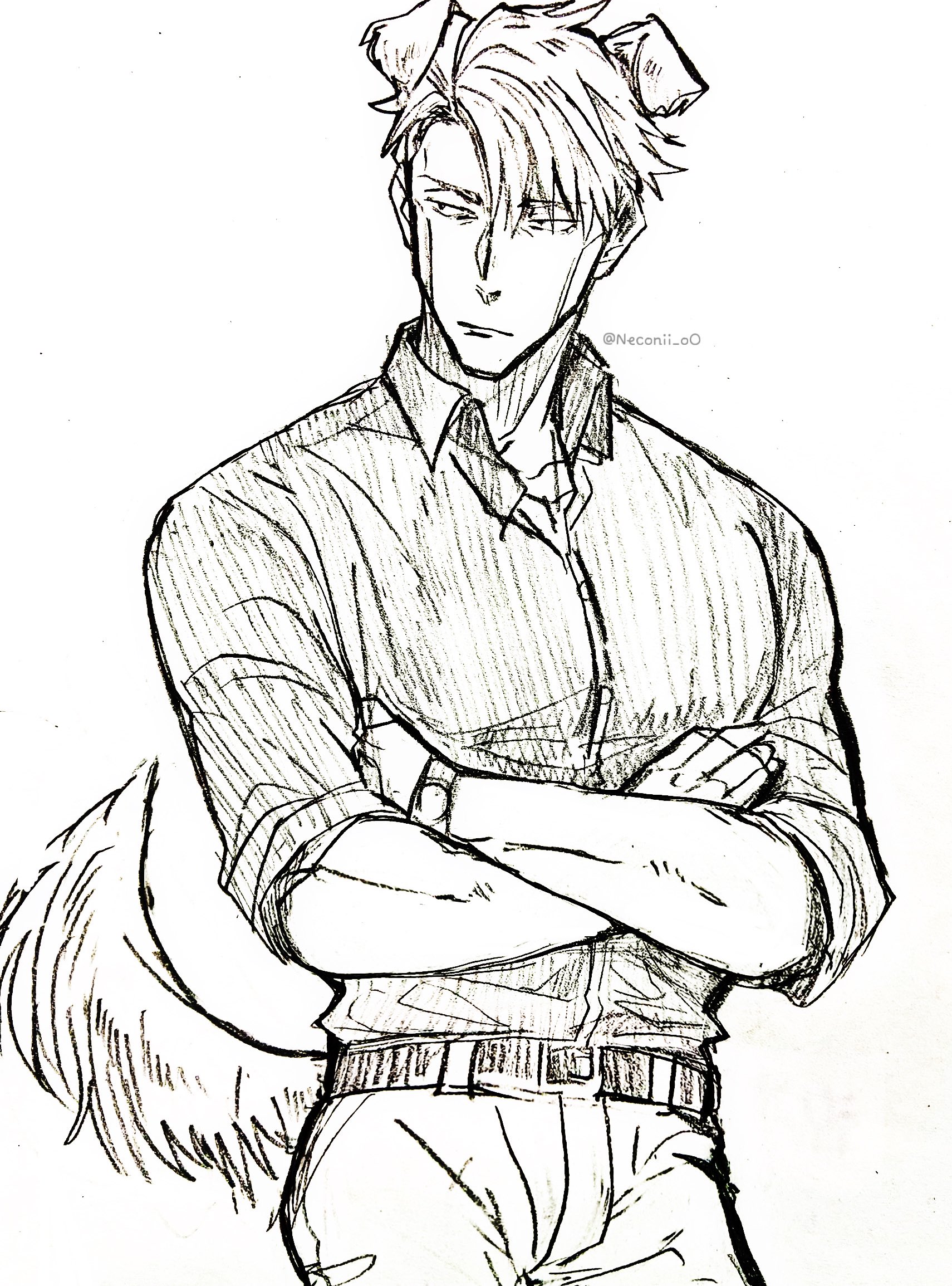 1boy animal_ears belt collared_shirt cowboy_shot crossed_arms dog_ears dog_tail highres jujutsu_kaisen long_sleeves male_focus nanami_kento nekonii pants shirt short_hair sleeves_rolled_up solo standing tail twitter_username watch