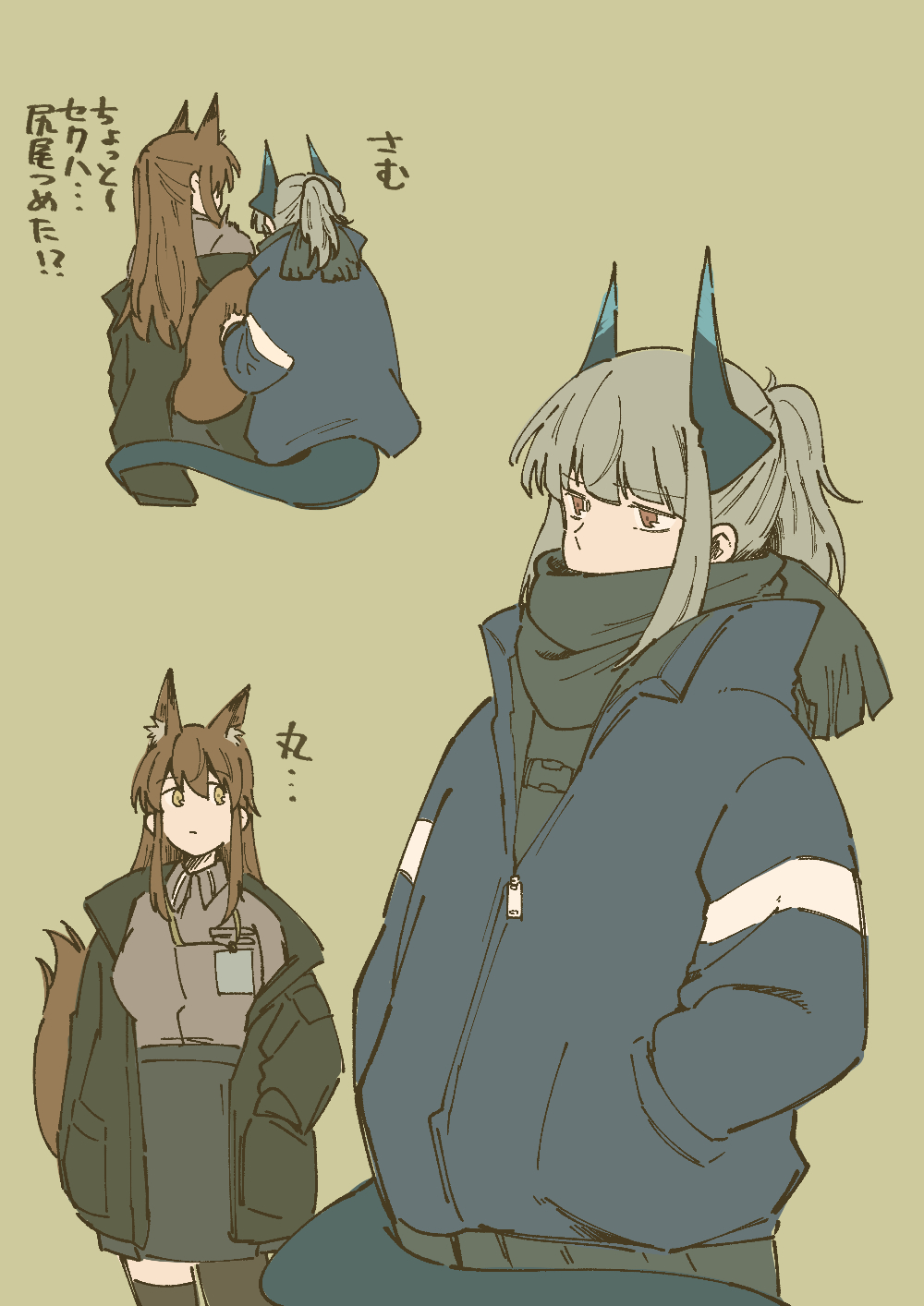 2girls animal_ear_fluff animal_ears arknights black_pantyhose black_scarf black_shirt black_skirt black_thighhighs blue_jacket brown_background brown_eyes brown_hair brown_shirt closed_mouth collared_shirt commentary_request covered_mouth dress_shirt franka_(arknights) fringe_trim grey_hair haruichi_(sazanami_complex) highres horns jacket liskarm_(arknights) long_hair multiple_girls pantyhose ponytail scarf shirt simple_background single_leg_pantyhose single_thighhigh skirt tail tail_grab thighhighs translation_request