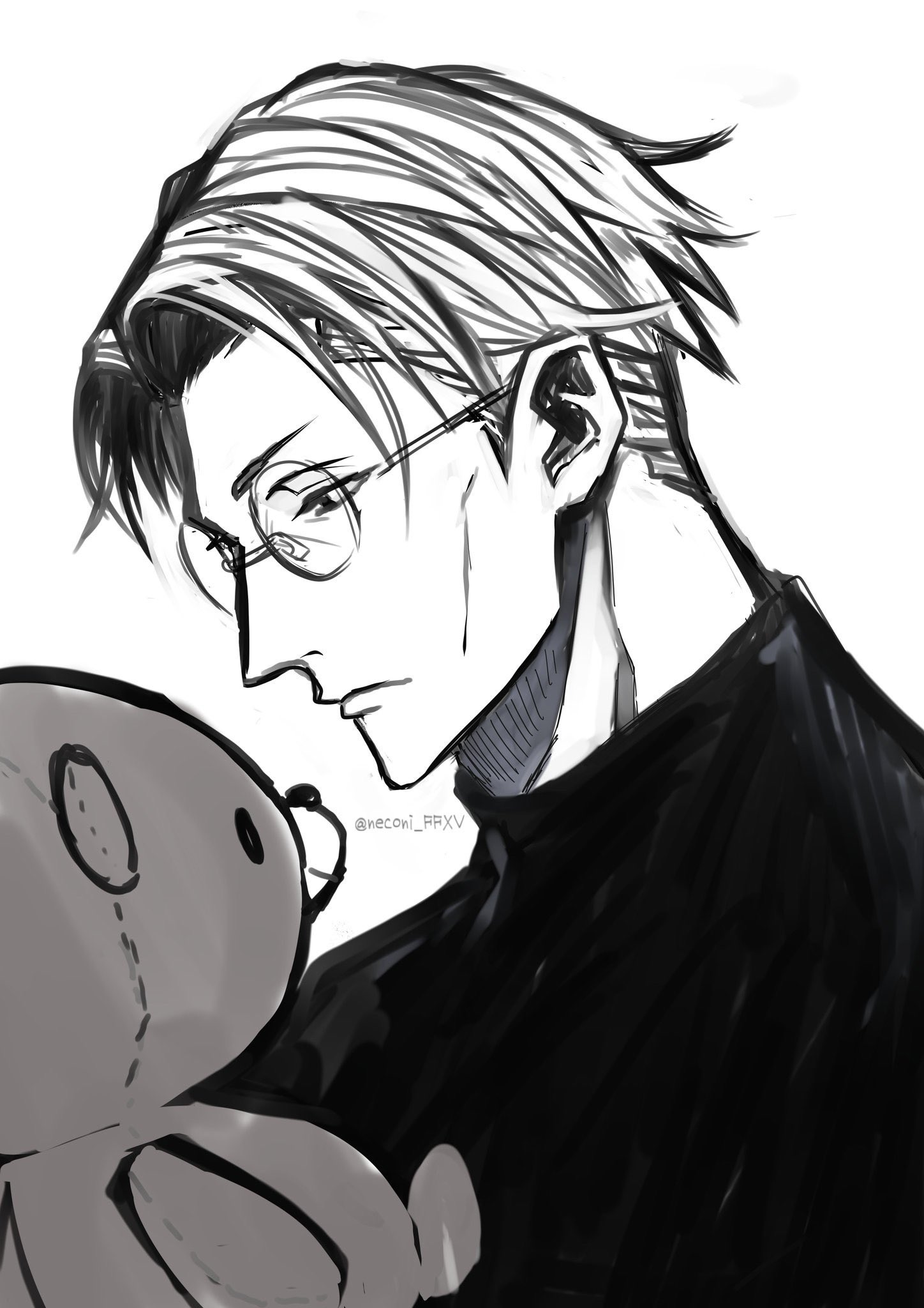 1boy collared_shirt glasses greyscale highres holding holding_stuffed_toy jujutsu_kaisen male_focus monochrome nanami_kento nekonii shirt short_hair solo stuffed_animal stuffed_toy teddy_bear twitter_username undercut upper_body