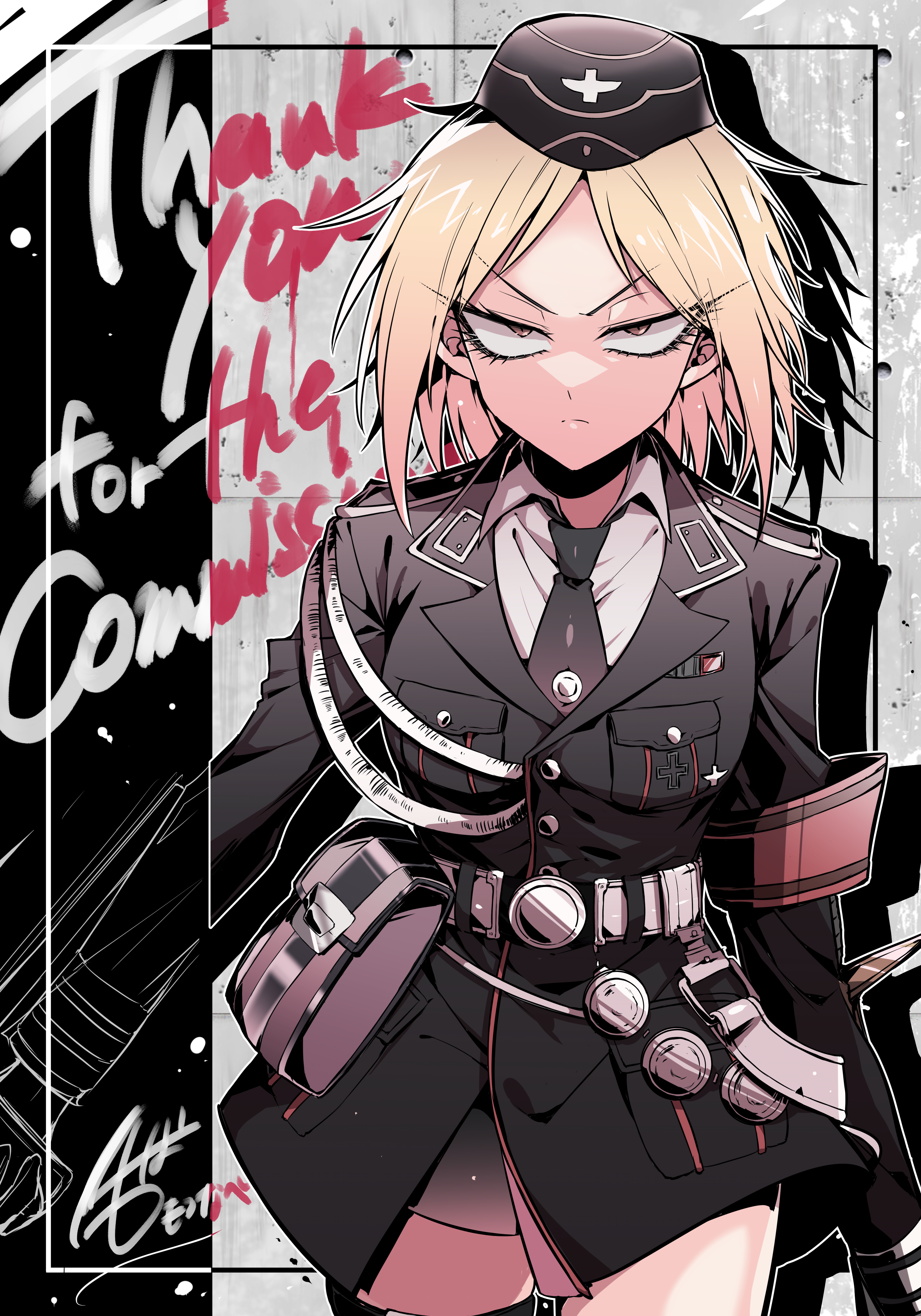 1girl absurdres angry armband blonde_hair breasts brown_eyes commission cowboy_shot erotunabe garrison_cap girls'_frontline hat highres long_sleeves looking_at_viewer medium_breasts military military_hat military_uniform mp40_(girls'_frontline) necktie red_armband saber_(weapon) shirt short_hair signature skeb_commission solo sword watermark weapon