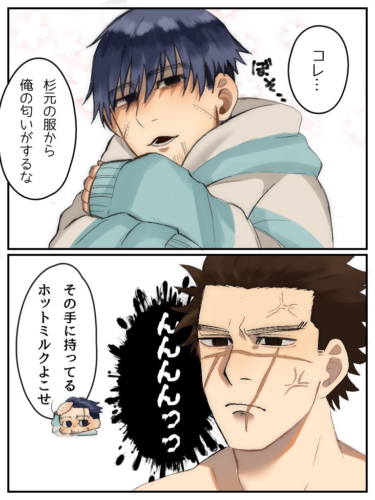 2boys 2koma alternate_costume anger_vein black_eyes black_hair blank_eyes blank_stare blush chibi chibi_inset comic deformed facial_hair facial_scar goatee golden_kamuy hair_strand hand_in_own_hair hood hoodie long_sleeves male_focus messy_hair motion_lines multiple_boys no_pants nose_blush ogata_hyakunosuke ri_(ri_kaos21) scar scar_on_cheek scar_on_face short_hair sick sleeves_past_wrists smug spiked_hair stitches stubble sugimoto_saichi translation_request undercut yaoi