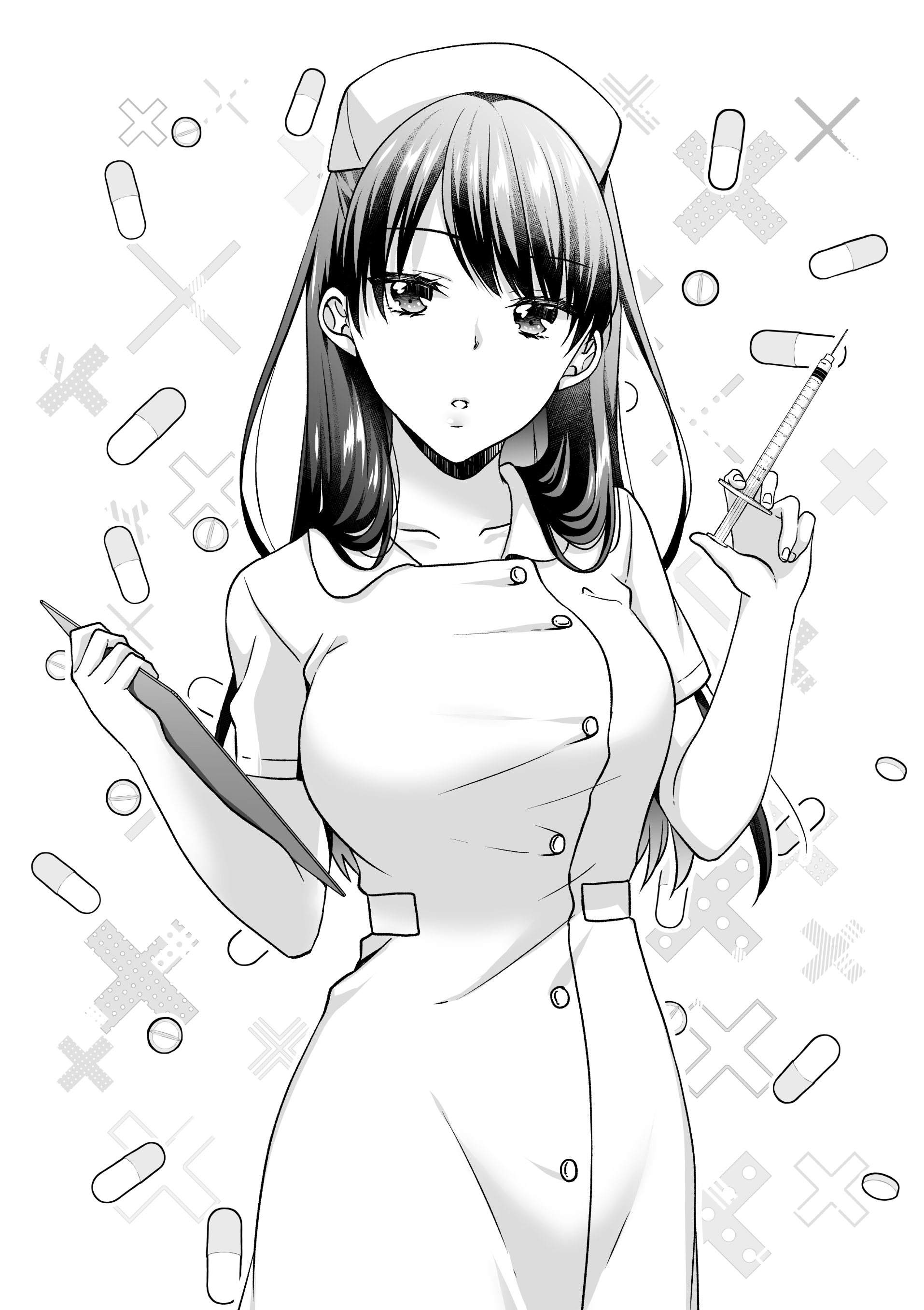 1girl :o absurdres breasts clipboard greyscale hat highres holding holding_syringe ice_cream_kanojo kawai_miruku kuune_rin large_breasts long_hair looking_at_viewer monochrome nurse nurse_cap parted_lips pill short_sleeves solo syringe