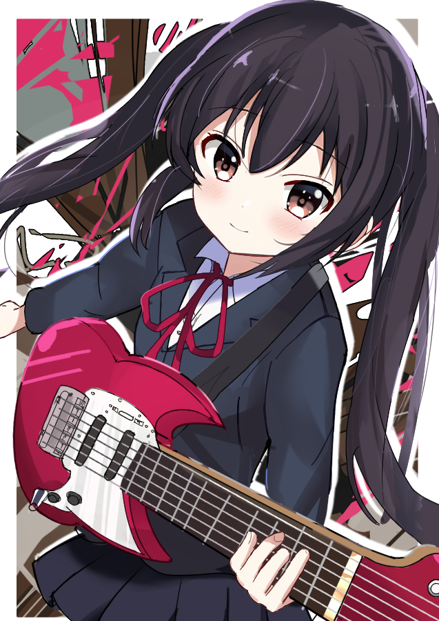 1girl black_hair black_jacket black_skirt blazer blush border brown_eyes chamoraile closed_mouth commentary_request guitar hair_between_eyes holding holding_instrument instrument jacket k-on! long_hair looking_at_viewer nakano_azusa neck_ribbon ribbon sakuragaoka_high_school_uniform school_uniform sidelocks skirt smile solo twintails white_border