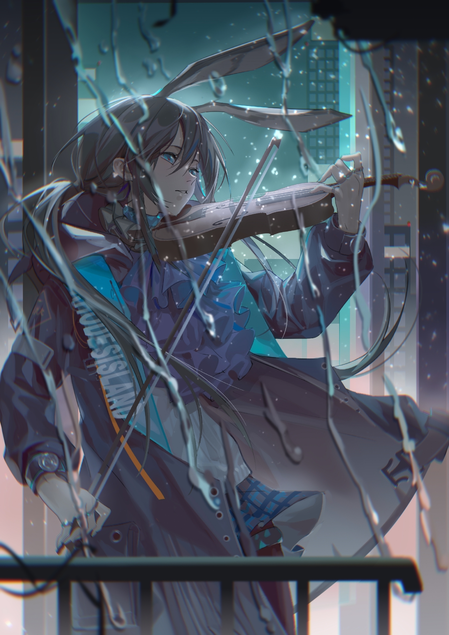 1girl amiya_(arknights) animal_ears arknights ascot black_pantyhose blue_ascot blue_coat blue_eyes blue_skirt bow_(music) brown_hair building chinese_commentary coat cowboy_shot e-majun highres holding holding_bow_(music) holding_instrument holding_violin instrument jewelry looking_afar open_clothes open_coat pantyhose parted_lips plaid_clothes plaid_skirt ponytail rabbit_ears rabbit_girl railing ring shirt sidelocks skirt skyscraper solo violin water_drop white_shirt