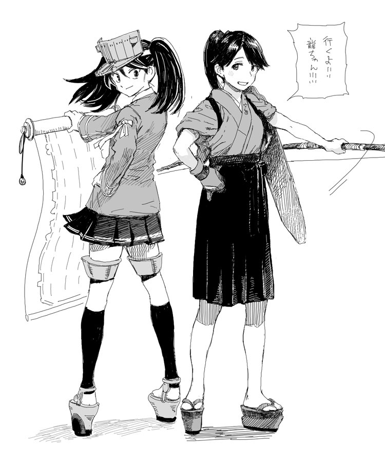 2girls artist_collaboration bow_(weapon) commentary_request flight_deck gloves greyscale gufu_(guffuumu) hakama hakama_skirt hand_on_own_hip hiro_(chumo) holding holding_scroll houshou_(kancolle) japanese_clothes kantai_collection kariginu kneehighs looking_back miniskirt monochrome multiple_girls okobo partially_fingerless_gloves partly_fingerless_gloves platform_footwear platform_sandals pleated_skirt ponytail ryuujou_(kancolle) sandals scroll skirt socks translation_request twintails visor_cap weapon yugake
