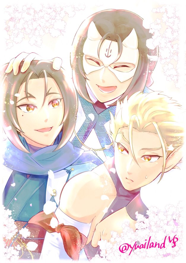 3boys aquaplus blonde_hair brown_eyes brown_hair closed_mouth fingernails haku_(utawarerumono) hand_on_another's_head height_difference looking_at_viewer mask medium_hair mikazuchi_(utawarerumono) mole mole_under_eye monochrome_mobius multiple_boys muscular muscular_male open_mouth pointy_ears scarf short_hair signature sleeveless sweat sweatdrop ukon_(utawarerumono) upper_body utawarerumono utawarerumono:_futari_no_hakuoro utawarerumono:_itsuwari_no_kamen yellow_eyes yuailand