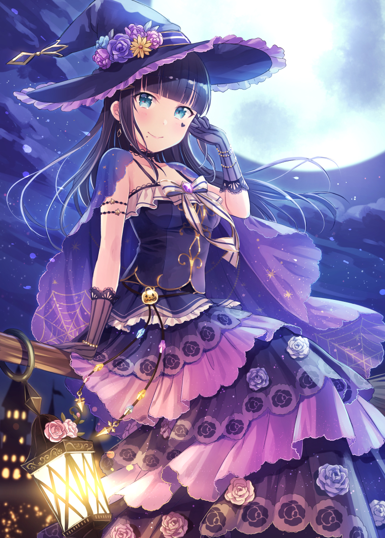 1girl aqua_eyes black_hair blunt_bangs bow breasts broom broom_riding cape closed_mouth commentary dress facial_tattoo flower gloves hand_up hat hat_flower heart heart_tattoo kurosawa_dia lantern layered_dress long_dress long_hair looking_at_viewer love_live! love_live!_school_idol_festival love_live!_sunshine!! medium_breasts mole mole_under_mouth moon moonlight night official_alternate_costume outdoors purple_cape purple_dress purple_gloves purple_hat sakou_mochi sitting_sideways sleeveless sleeveless_dress smile solo spaghetti_strap star_(sky) striped_clothes striped_gloves tattoo vertical-striped_clothes vertical-striped_gloves white_bow witch_hat