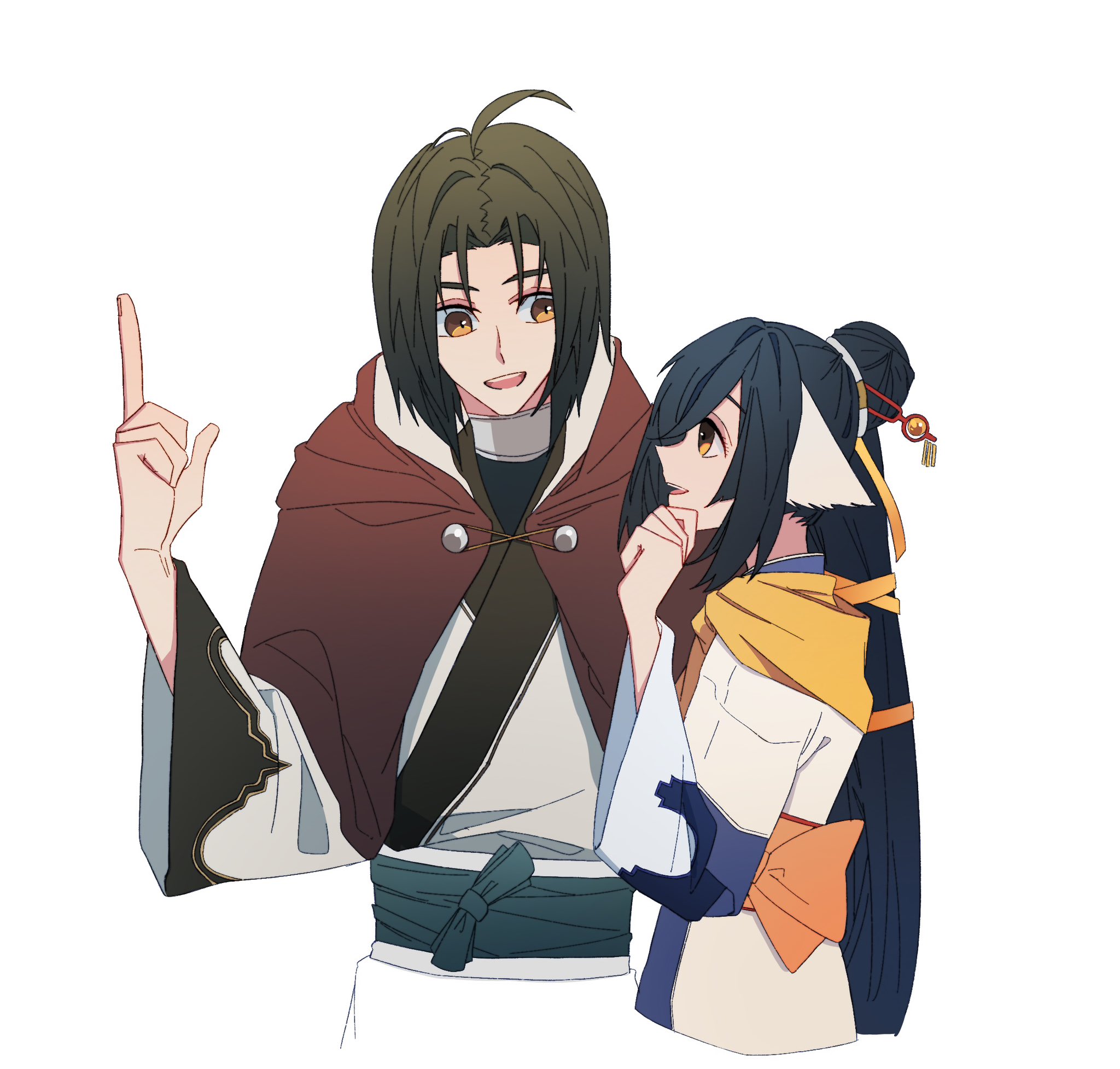 1boy 1girl absurdly_long_hair ahoge ainu_clothes animal_ears aquaplus black_hair brown_hair dress hair_between_eyes hair_ornament haku_(utawarerumono) height_difference high_ponytail highres hood hood_down kakakawaz kuon_(utawarerumono) layered_sleeves long_hair long_sleeves looking_at_another open_mouth orange_eyes orange_sash ponytail sash scarf sidelocks swept_bangs teeth tongue utawarerumono utawarerumono:_itsuwari_no_kamen very_long_hair