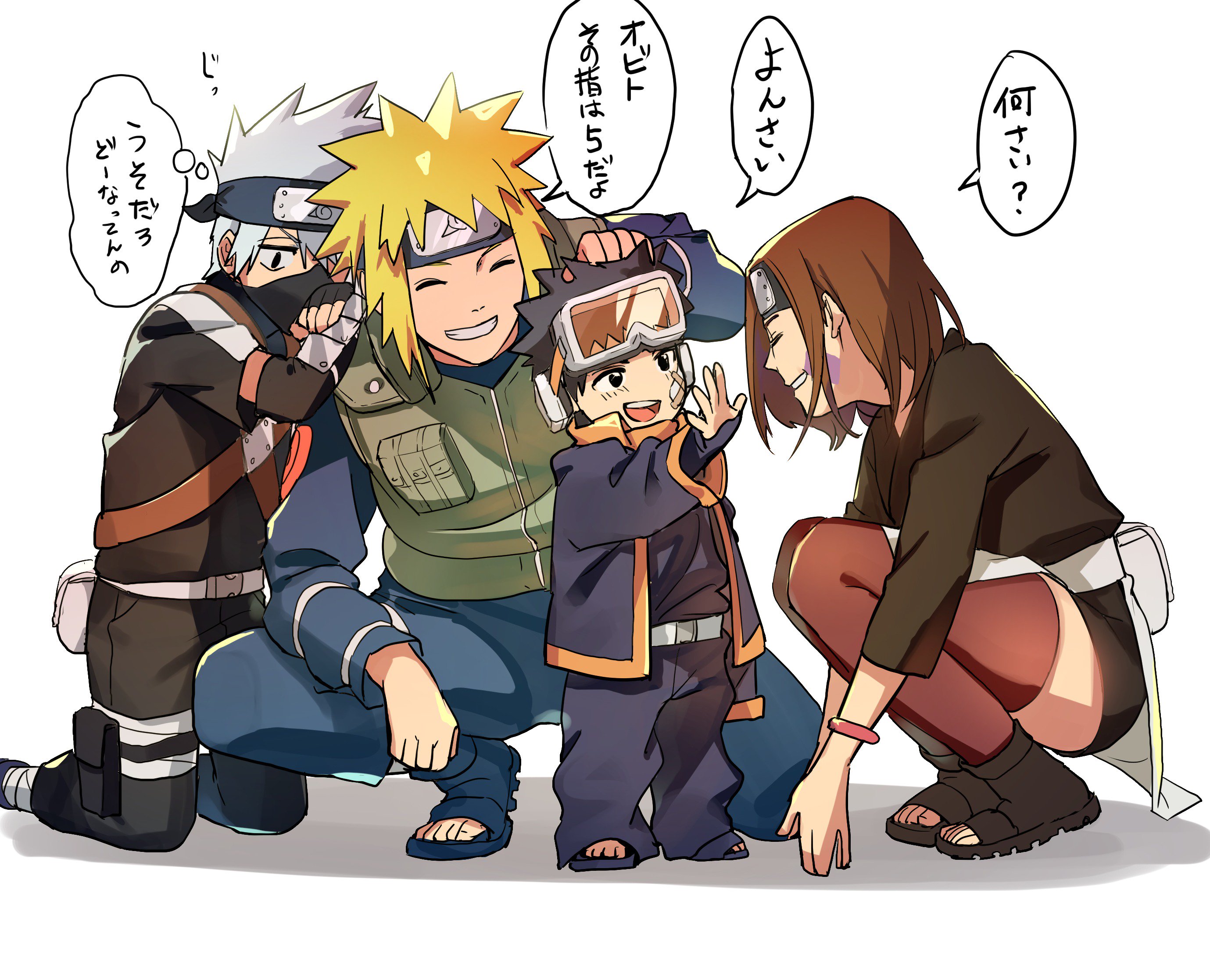 1girl 3boys aged_down black_eyes black_hair blonde_hair bracelet brown_hair child facial_mark flak_jacket forehead_protector goggles goggles_on_head green_vest grey_hair grin hatake_kakashi headband headpat highres jacket jewelry kneeling konohagakure_symbol long_sleeves mask mouth_mask multiple_boys namikaze_minato naruto_(series) naruto_shippuuden nohara_rin open_mouth pouch sandals sekisei simple_background sleeves_past_wrists smile squatting thighhighs translation_request uchiha_obito vest