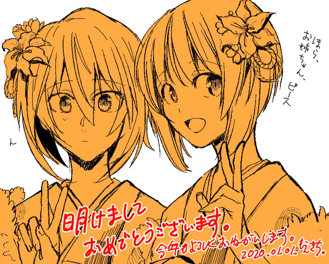 2girls flower girls_und_panzer hair_flower hair_ornament japanese_clothes kimono looking_at_viewer moekichi multiple_girls nishizumi_maho nishizumi_miho open_mouth short_hair simple_background smile translation_request v white_background yukata