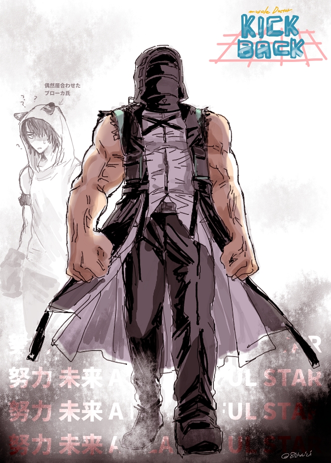 2boys arknights black_coat black_pants broca_(arknights) broca_(rest_between_sets)_(arknights) coat commentary_request doctor_(arknights) haizi0812 hood hood_up hooded_coat kick_back_(song) multiple_boys muscular muscular_male official_alternate_costume oversized_limbs pants parody sleeveless sleeveless_coat translation_request walking