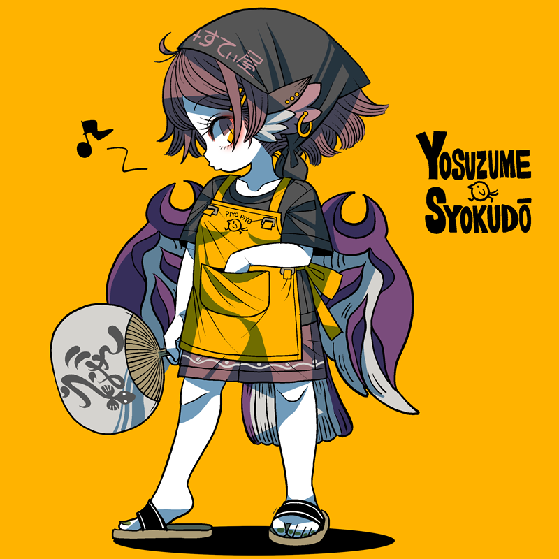 1girl animal_ears apron bird_ears bird_wings black_headscarf black_headwear black_shirt brown_shorts clothes_writing earrings eighth_note full_body hair_ornament hairclip hand_fan headscarf holding holding_fan jewelry musical_note mystia_lorelei paper_fan pink_hair sandals shirt short_hair short_sleeves shorts simple_background single_earring solo touhou uchiwa white_wings wings yellow_apron yellow_background yellow_eyes yt_(wai-tei)