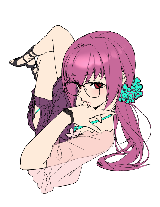 1girl bikini blue_bikini crossed_legs fate/grand_order fate_(series) glasses k52 long_hair purple_hair red_eyes scathach_(fate) scathach-skadi_(fate) scathach-skadi_(swimsuit_ruler)_(second_ascension)_(fate) scrunchie simple_background smile solo swimsuit toeless_footwear white_background