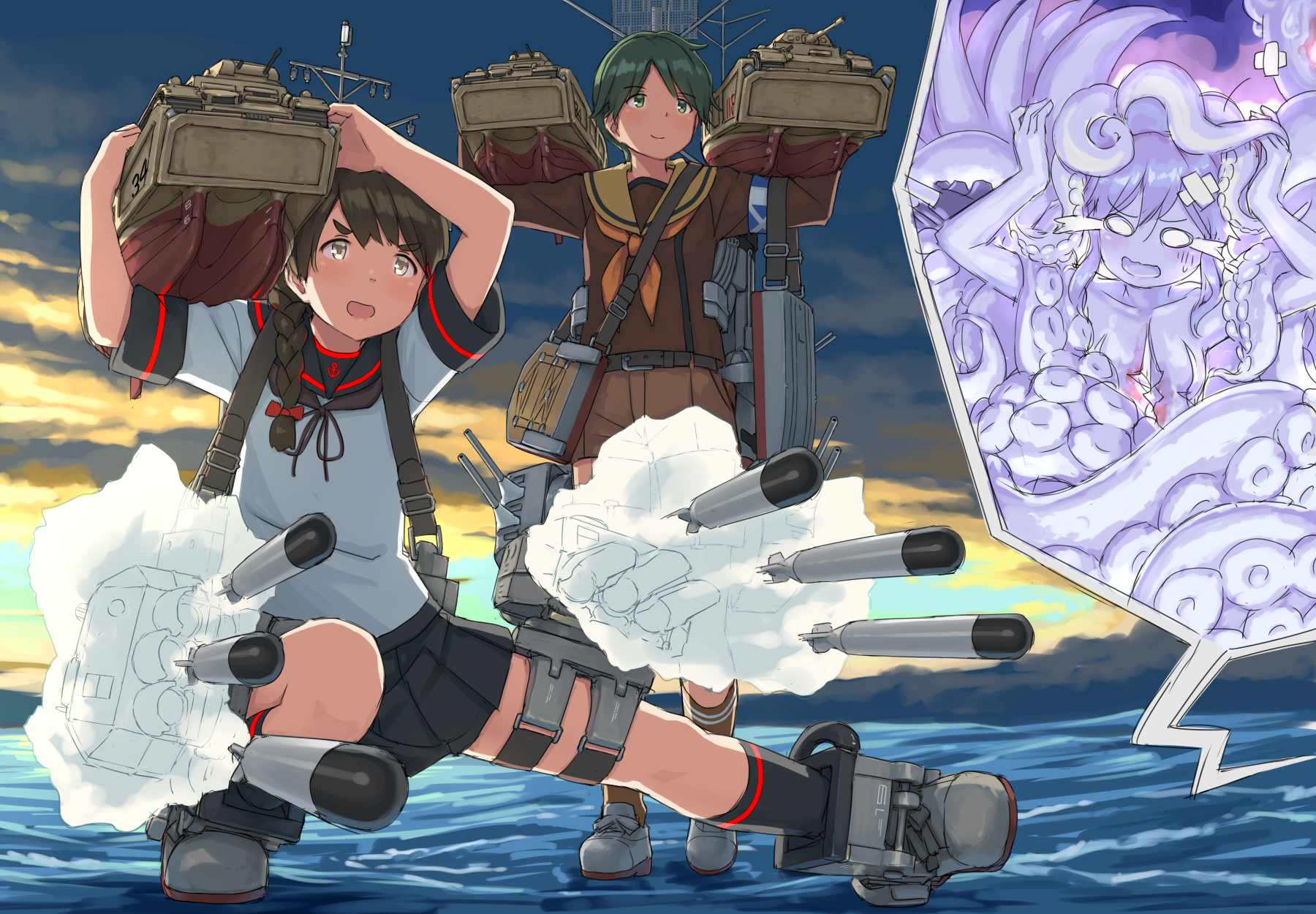 3girls abyssal_ship adapted_turret black_sailor_collar black_skirt black_socks braid brown_eyes brown_hair brown_sailor_collar brown_serafuku brown_shorts brown_socks cannon green_eyes green_hair hair_over_shoulder hair_ribbon hayashi_naoharu highres incomplete_battleship_princess kantai_collection long_hair long_sleeves miniskirt mogami_(kancolle) mogami_kai_ni_(kancolle) monster_girl multiple_girls neckerchief ocean orange_neckerchief outdoors pleated_skirt red_ribbon ribbon rigging sailor_collar school_uniform scylla serafuku short_hair short_sleeves shorts single_braid skirt socks standing standing_on_liquid tentacle_hair torpedo uranami_(kancolle) uranami_kai_ni_(kancolle)