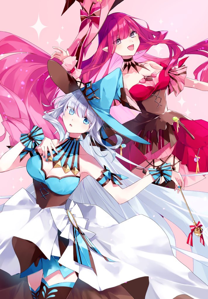 2girls baobhan_sith_(fate) baobhan_sith_(valentine_witches)_(fate) blue_eyes chocolate chocolate_clothes chocolate_on_body chocolate_on_legs collar dress fate/grand_order fate_(series) food-themed_clothes food_on_body grey_eyes grey_hair hat looking_at_viewer misaki346 morgan_le_fay_(fate) morgan_le_fay_(valentine_witches)_(fate) mother_and_child mother_and_daughter multiple_girls parent_and_child pink_hair pink_headwear pointy_ears red_dress sidelocks spiked_collar spikes witch_hat