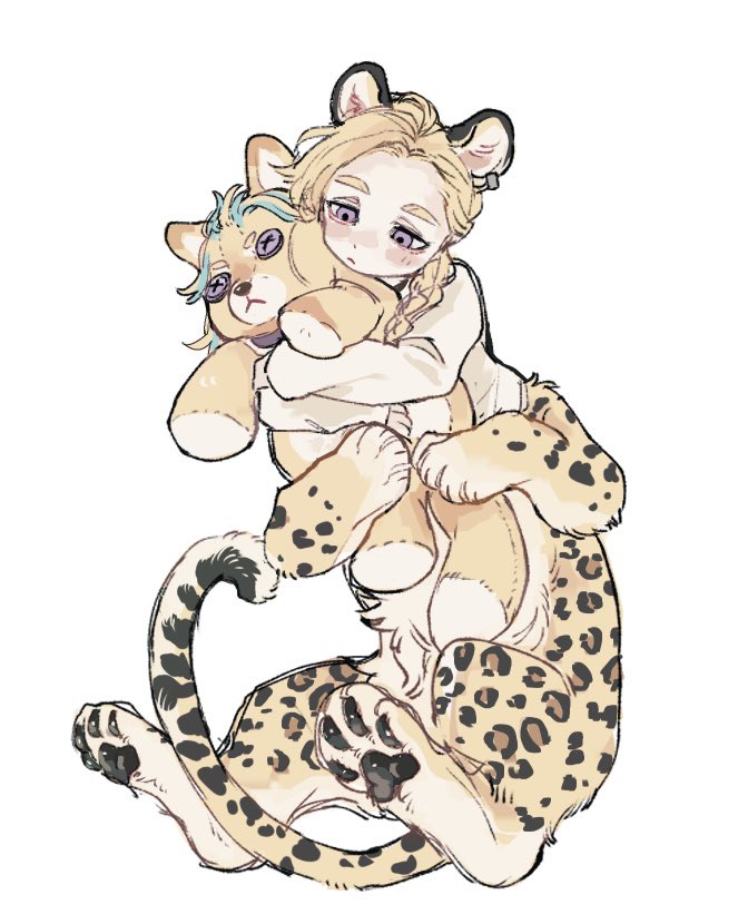 1girl animal_ears blonde_hair blush body_fur braid centauroid earrings female_focus jewelry leopard_ears leopard_girl long_sleeves monster_girl hugging_object original pawpads purple_eyes simple_background single_earring solo stuffed_toy taur thick_eyebrows twin_braids white_background