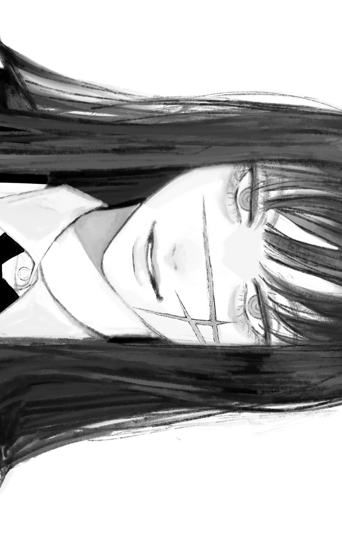1girl black_hair chainsaw_man close-up collared_shirt commentary facial_scar greyscale highres long_hair looking_at_viewer monochrome n9c4z portrait ringed_eyes scar scar_on_cheek scar_on_face scar_on_nose shirt sideways simple_background smile solo straight-on straight_hair white_background white_shirt yoru_(chainsaw_man)