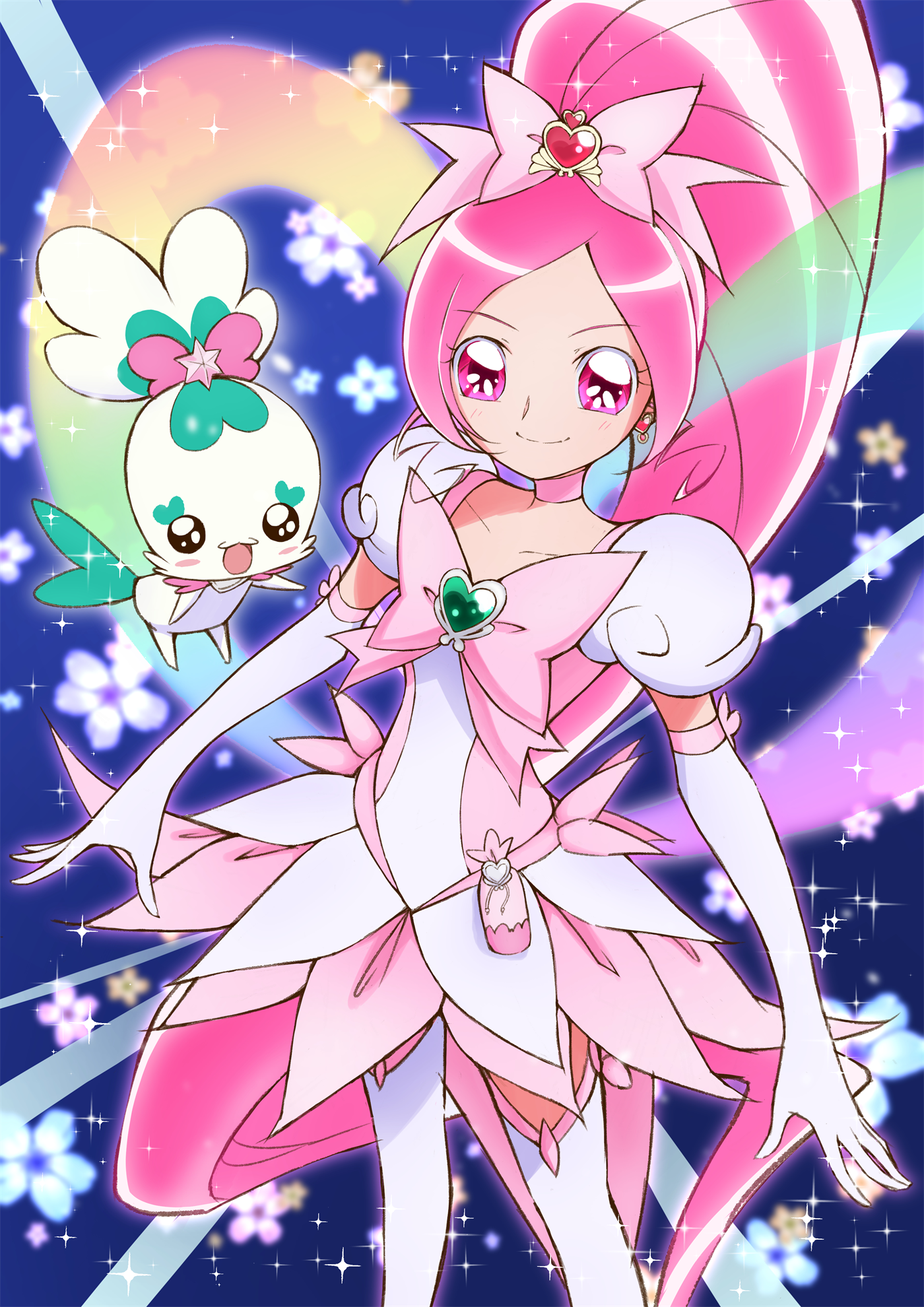 1girl absurdly_long_hair aizawa_zawapo bow choker chypre_(precure) collarbone cure_blossom cure_blossom_(super_silhouette) earrings elbow_gloves floating_hair gem gloves green_gem hair_bow hair_ornament heart heart_earrings heart_hair_ornament heartcatch_precure! high_ponytail highres jewelry long_hair miniskirt parted_bangs pink_bow pink_choker pink_hair pink_skirt ponytail precure red_eyes red_gem short_sleeves skirt solo standing thighhighs very_long_hair white_gloves white_thighhighs