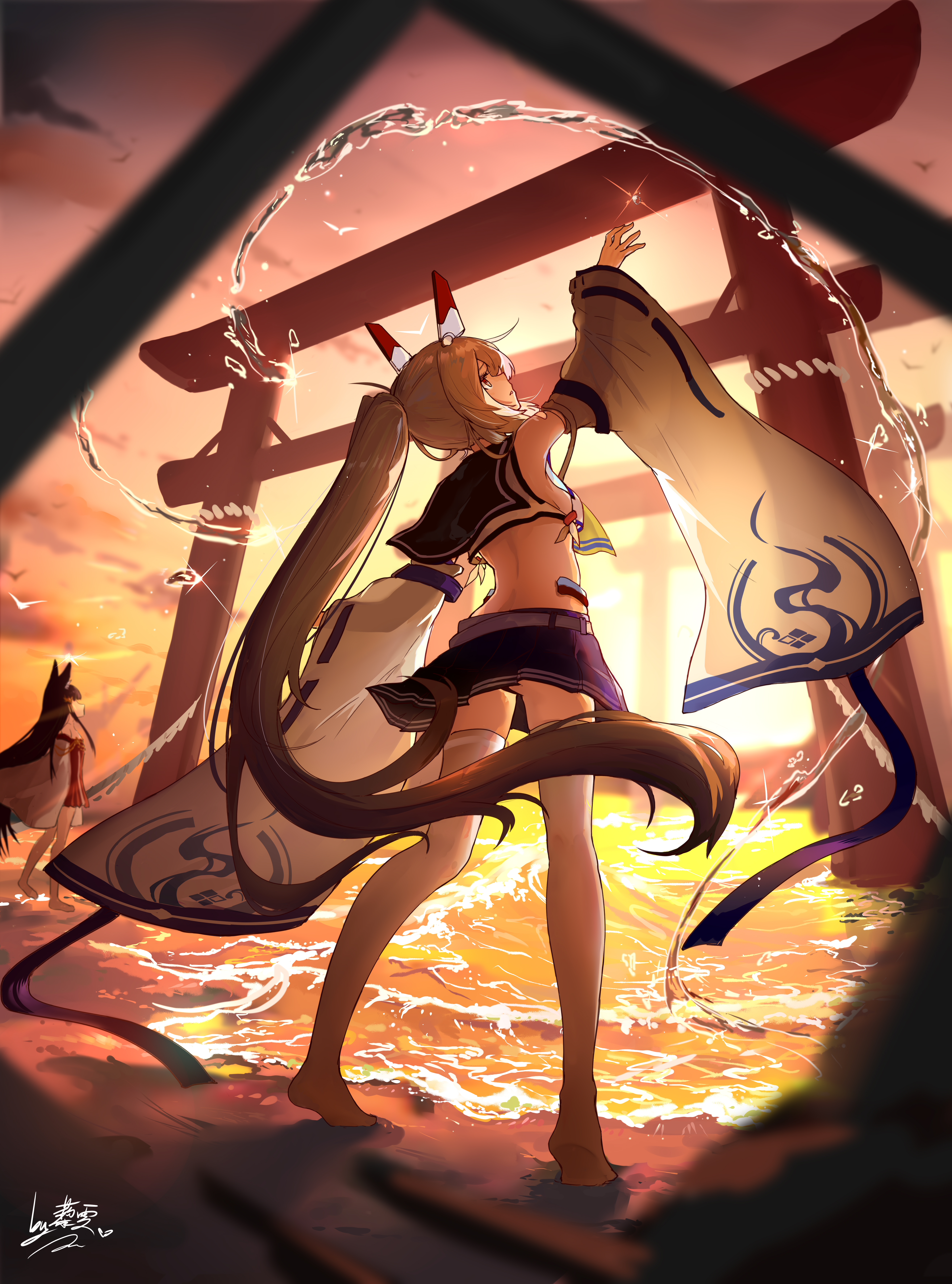 2girls absurdres animal_ears arm_up ayanami_(azur_lane) ayanami_(retrofit)_(azur_lane) azur_lane beach black_hair cloud cloudy_sky commentary_request detached_sleeves dress fox_ears fox_girl from_behind full_body hair_between_eyes hair_ornament head_tilt headgear highres light_brown_hair liwendala long_hair long_sleeves looking_afar looking_away looking_up md5_mismatch midriff multiple_girls nagato_(azur_lane) no_shoes ocean orange_eyes parted_lips pleated_skirt ponytail reaching red_dress resolution_mismatch revision ribbon-trimmed_sleeves ribbon_trim scenery school_uniform serafuku sidelocks skirt sky solo_focus source_smaller standing sunset thighhighs torii twilight water wide_sleeves zettai_ryouiki