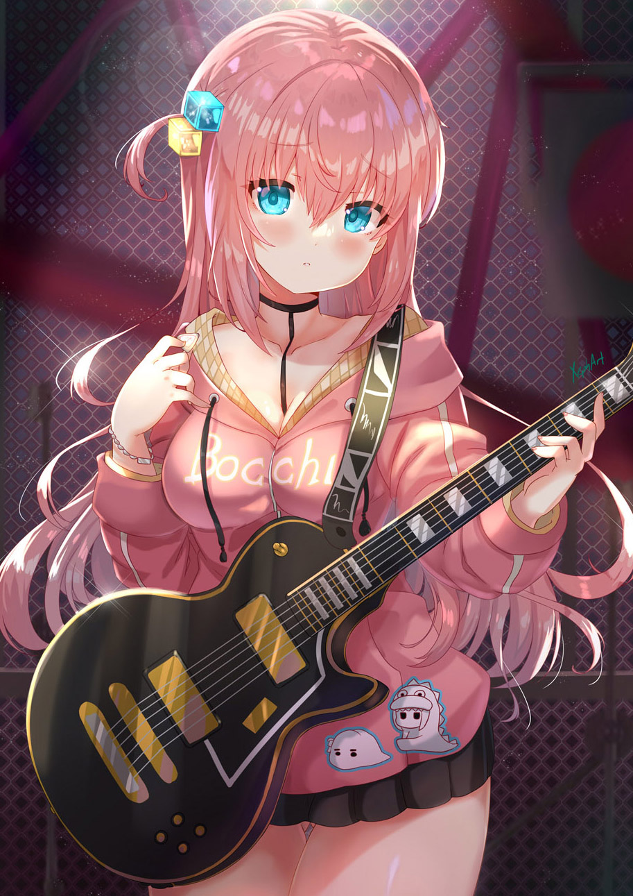 1girl between_breasts blue_eyes blush bocchi_the_rock! breasts chain-link_fence cleavage closed_mouth collarbone commentary_request cube_hair_ornament electric_guitar fence guitar hair_between_eyes hair_ornament highres instrument long_hair looking_at_viewer medium_breasts pink_hair solo xephonia