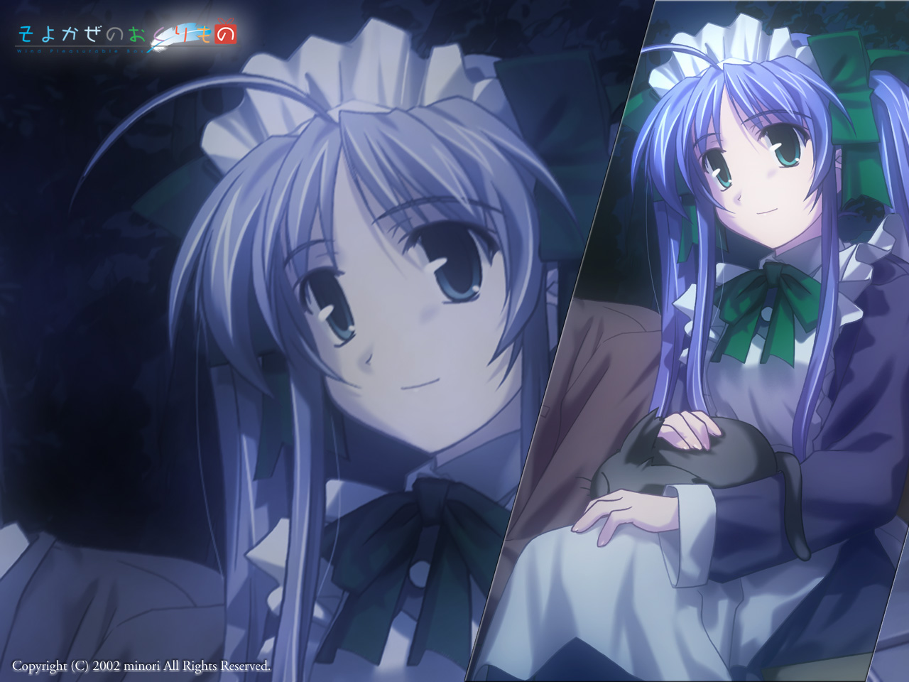 00s 1girl breasts copyright_notice maid medium_breasts narukaze_minamo school_uniform serafuku twintails waitress wind_a_breath_of_heart yuuki_tatsuya zoom_layer