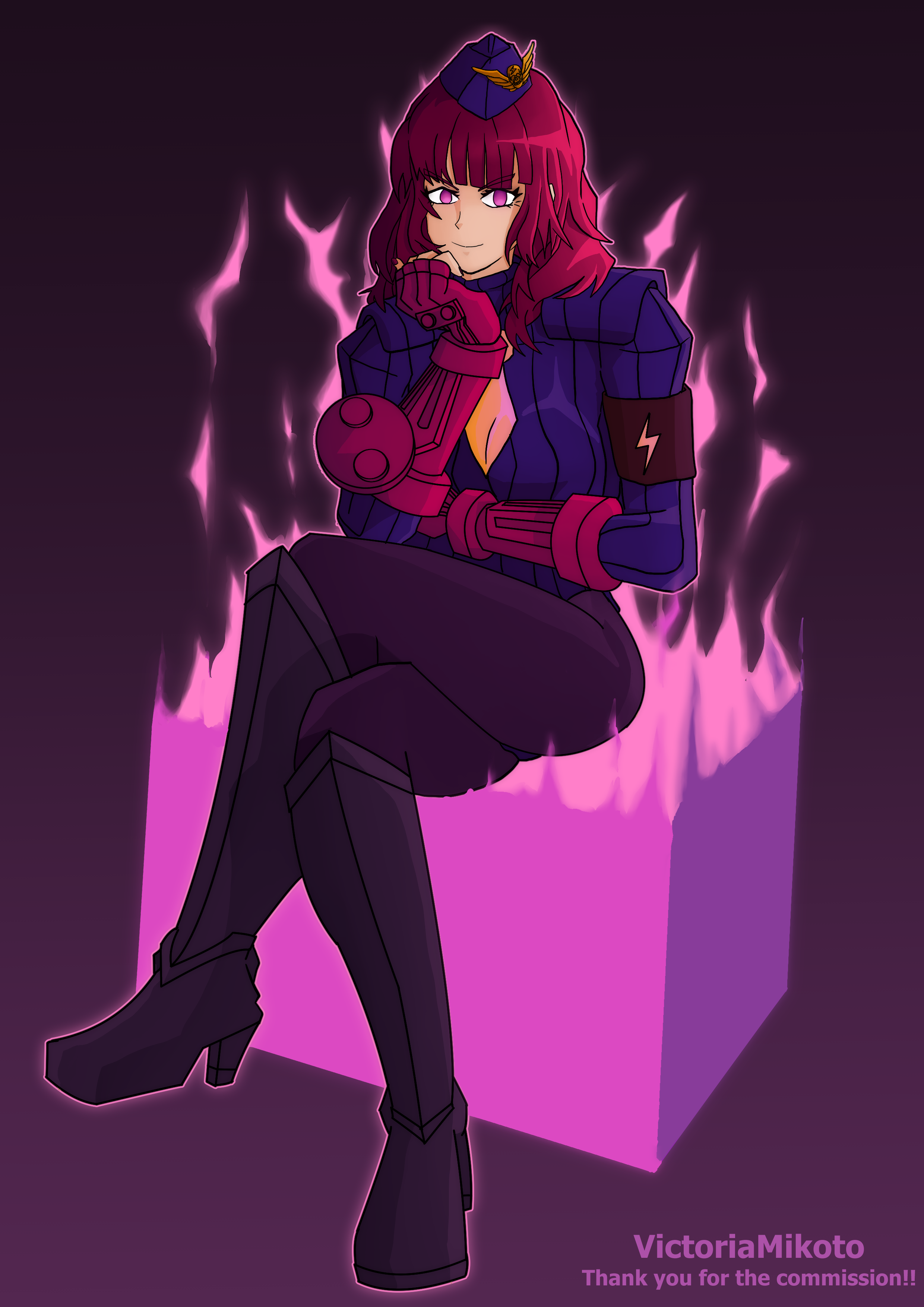 1girl absurdres bodysuit boots breasts celica_(fire_emblem) corruption fire fire_emblem fire_emblem_echoes:_shadows_of_valentia gauntlets hat heart heart-shaped_pupils highres large_breasts leather leather_boots leotard looking_at_viewer mind_control necktie nintendo pink_eyes red_hair self-upload shadaloo_dolls street_fighter symbol-shaped_pupils victoria_mikoto