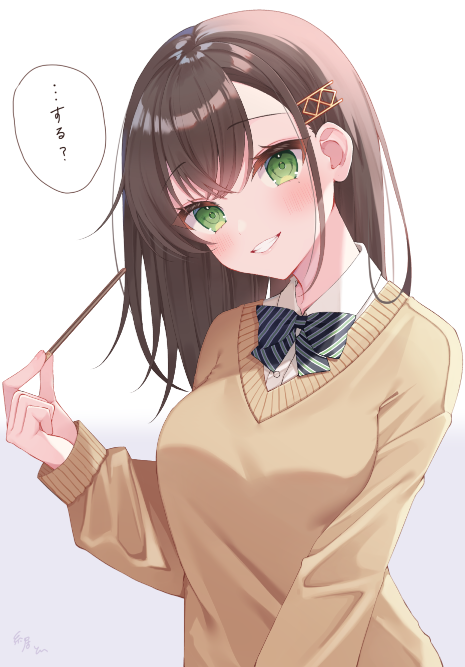 &{ID:7920803 CreatedAt:Sun Nov 13 21:00:49 -0600 2022 Score:2 Width:929 Height:1333 MD5:5d73c5d6394bd59ebfce6fd1e3ca6199 Directory:5d/73 Image:5d73c5d6394bd59ebfce6fd1e3ca6199.png Rating:general Source:https://www.pixiv.net/artworks/102721153 Change:1754305912 Owner:danbooru CreatorID:6498 ParentID:0 Sample:0 PreviewHeight:350 PreviewWidth:243 Tags:1girl blush bow brown_hair brown_sweater collared_shirt commentary_request diagonal-striped_bow dress_shirt food gradient_background green_eyes grey_background grin hair_between_eyes hair_ornament head_tilt highres holding holding_food itoi_toi long_sleeves looking_at_viewer original pocky puffy_long_sleeves puffy_sleeves school_uniform shirt signature sleeves_past_wrists smile solo striped_bow sweater translation_request upper_body white_background white_shirt Title: HasNotes:false HasComments:false FileURL:https://img2.gelbooru.com/images/5d/73/5d73c5d6394bd59ebfce6fd1e3ca6199.png PreviewURL:https://gelbooru.com/thumbnails/5d/73/thumbnail_5d73c5d6394bd59ebfce6fd1e3ca6199.jpg SampleURL: SampleHeight:0 SampleWidth:0 Status:active PostLocked:0 HasChildren:false IsVideo:false DisplayDate:13.11.2022 21:00}